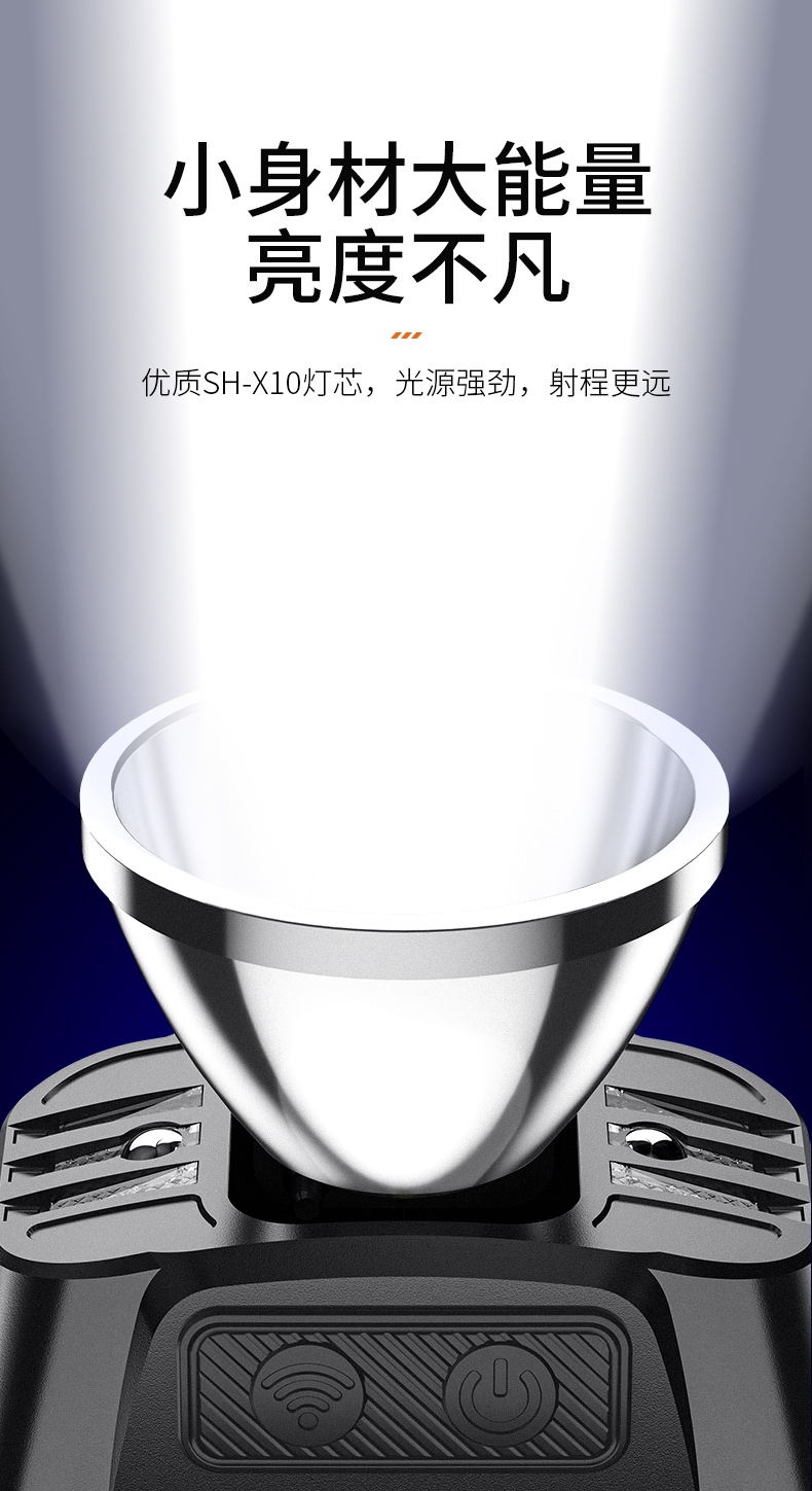 1、單擊左邊開關開啟感應功能,續按關閉感應功能,當感應功能開啟時,單擊右邊開關可正常調節檔位。 2、充電時紅色指示燈常亮,充滿時藍色指示燈常亮。 3、此款頭燈款式潮流、設計小巧、攜帶方便、頭帶材質柔軟、可自由拆卸、便于清洗。
