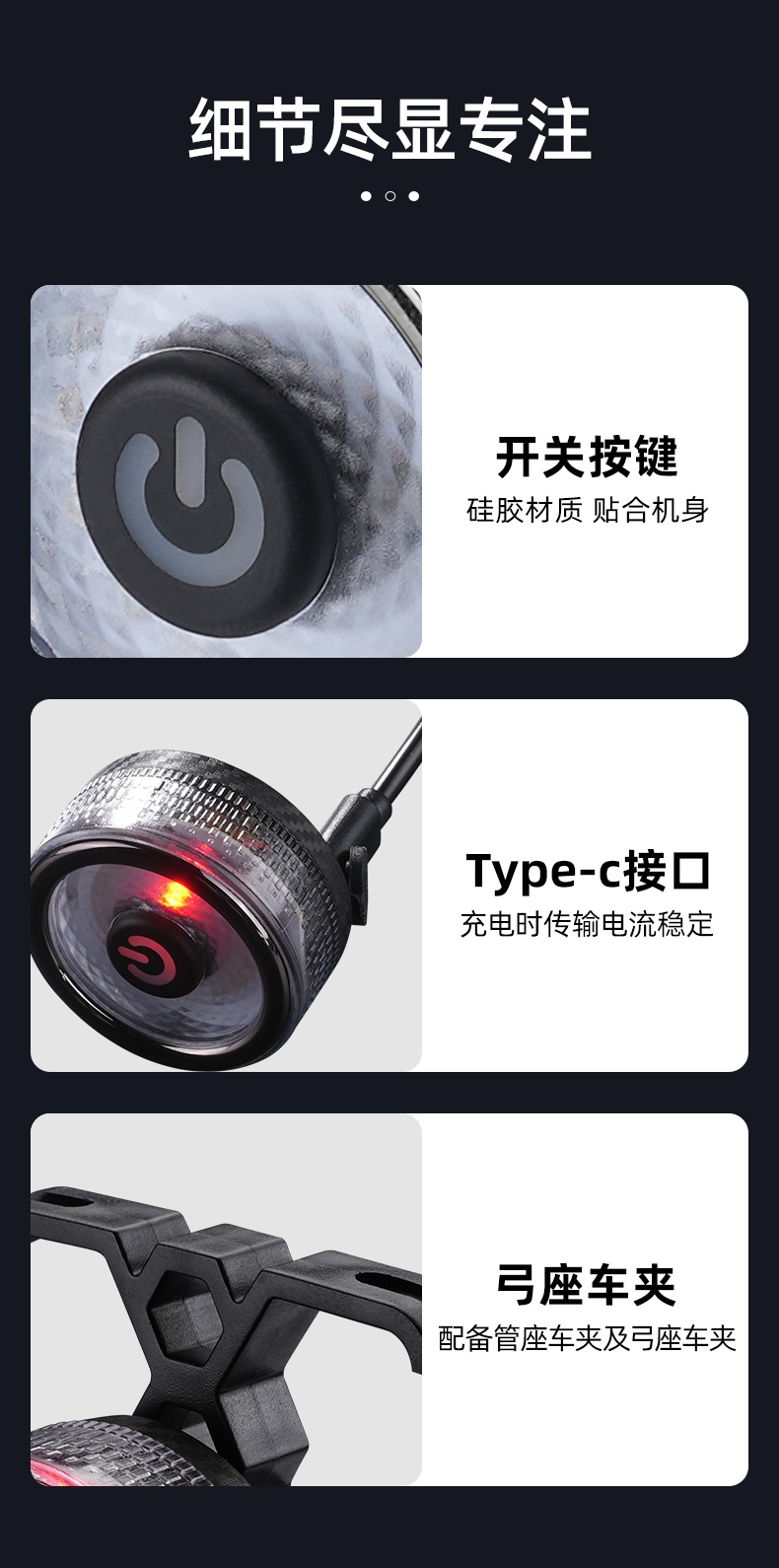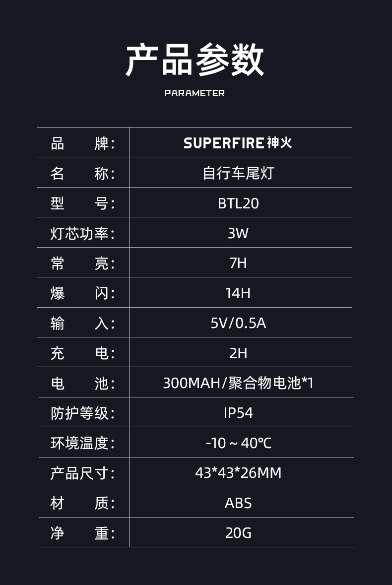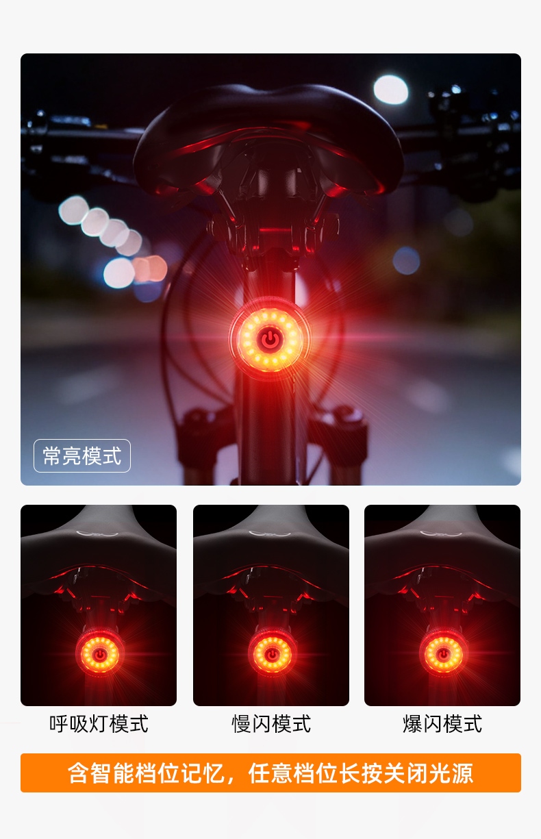 1、長按開關鍵開啟光源,擋位依次:常亮-呼吸燈-慢閃-爆閃-循環,任意擋位下長按關閉。燈具自帶擋位記憶功能,再次開啟時為之前關閉擋位;
