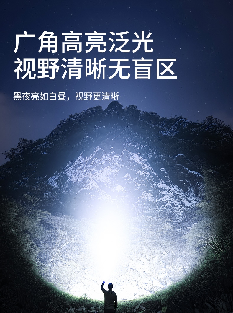 聚光主燈 亮度隨心 輕按后端開關按鈕,主燈強光點亮,續按依次切換主燈工作光-爆閃光。主燈開啟狀態下長按5秒,可實現光源色溫轉換。主燈關閉狀態下長按5秒,可開啟燈具最亮照明模式。 爆亮強光 亮如白晝 1500LM大功率高亮光源,點亮頃刻如白晝