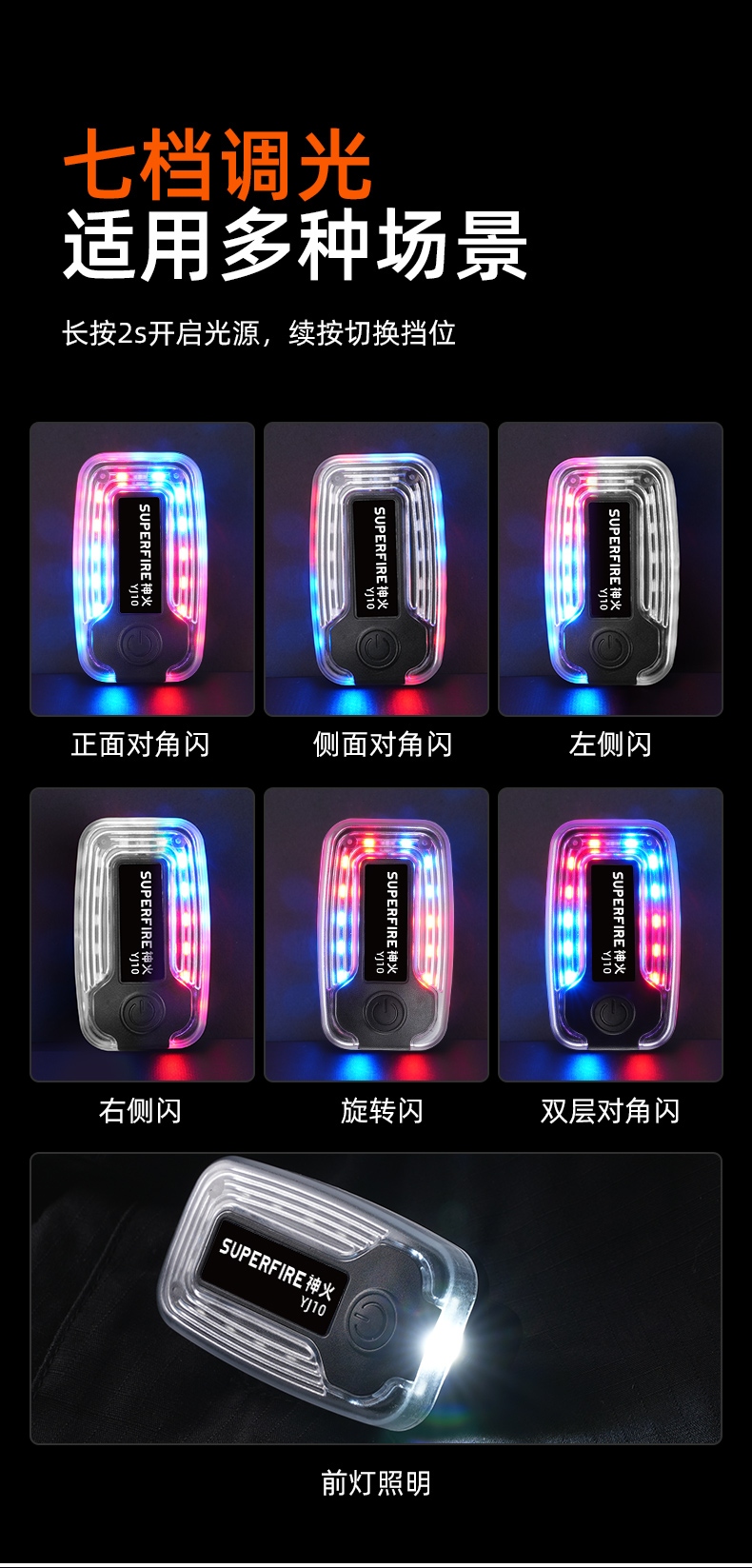 1、長按開關鍵2秒開啟光源,擋位依次:正面對角閃-側面對角閃-左側閃-右側閃-旋轉閃-雙層對角閃-前燈照明-循環,任意模式下長按關閉。