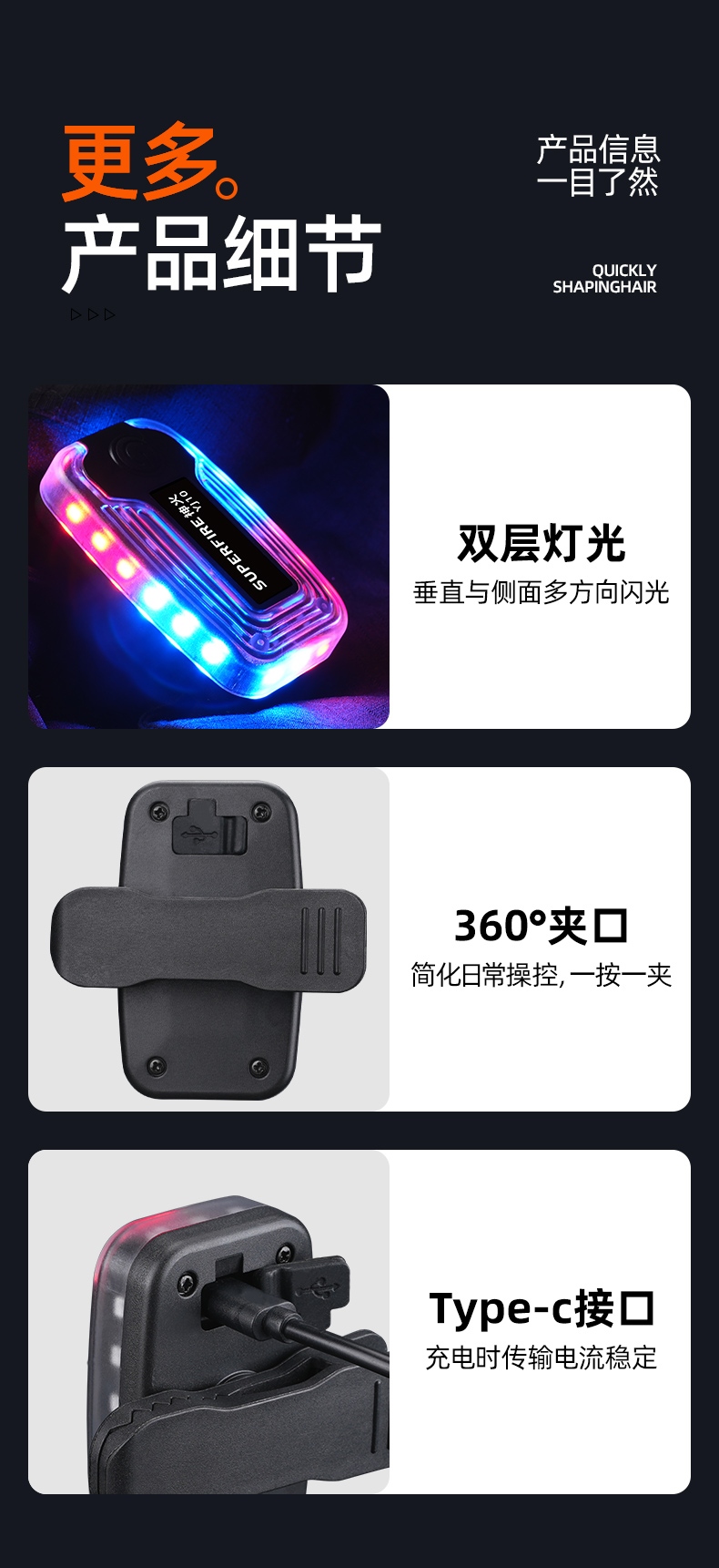 7擋燈光模式、夾口固定、夾口360度旋轉、手拍換擋、8種文字標可選