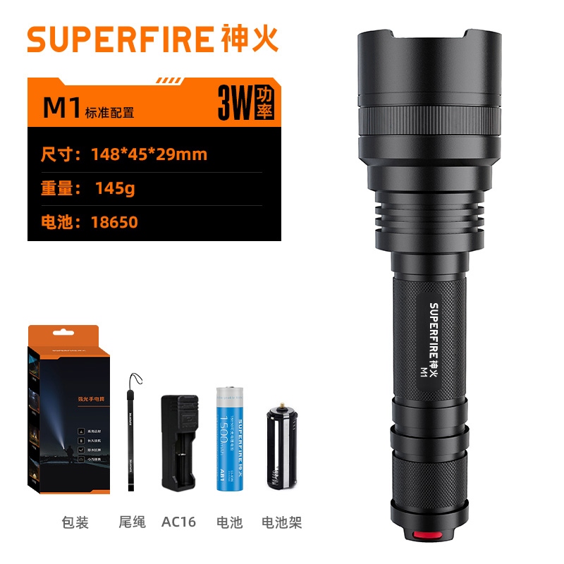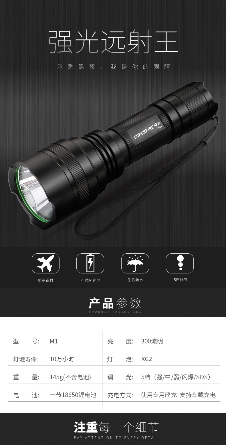 1、千米遠射,射程更遠,光斑更聚焦。 2、進口燈珠,亮度高,照明效果更好。 3、前后雙按鍵,光源一鍵點亮,高亮瞬間開啟。