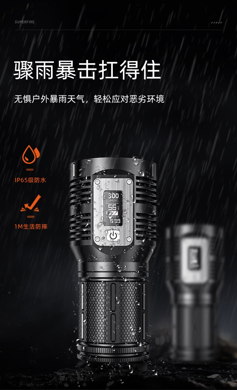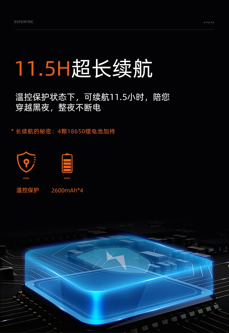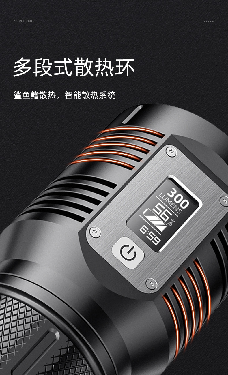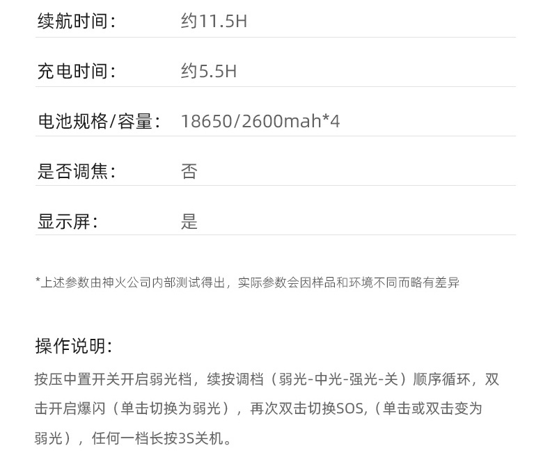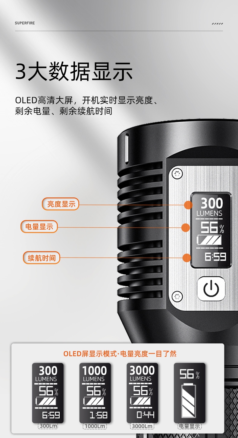 1、帶顯示屏,可顯示光通量、電量百分比、續(xù)航時間等信息。