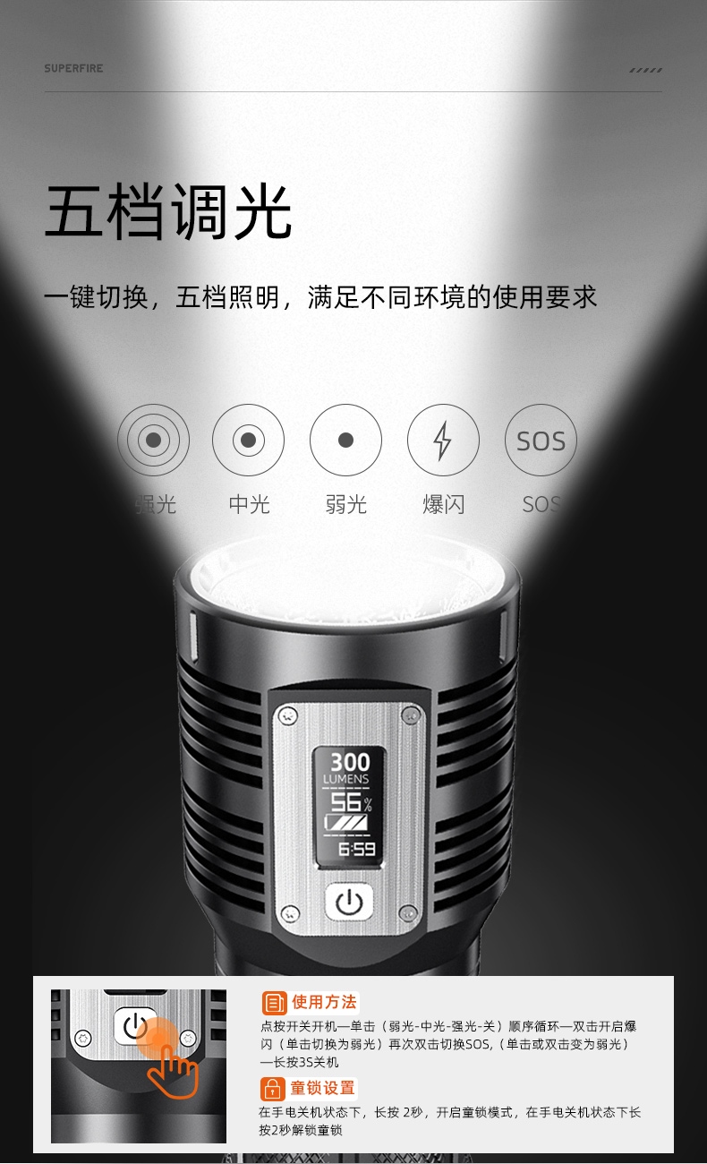4、按壓中置開關(guān)開啟弱光檔,續(xù)按調(diào)檔(弱光-中光--強光-關(guān))順序循環(huán),雙擊開啟爆閃再次雙擊切換SOS,(爆閃或SOS模式下單擊切換為弱光),任何一檔長按3S關(guān)機。在手電關(guān)機狀態(tài)下,長按2秒,開啟童鎖模式,在手電關(guān)機狀態(tài)下長按2秒解鎖童鎖。