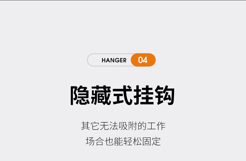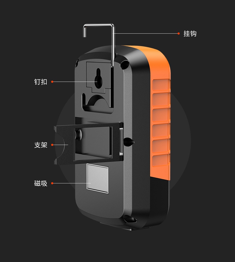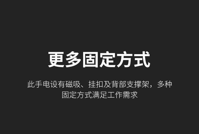 2.此手電設(shè)有磁吸,掛扣及背部支撐架,多種固定方式滿足工作需求;