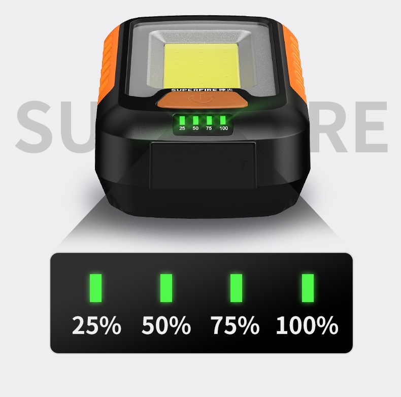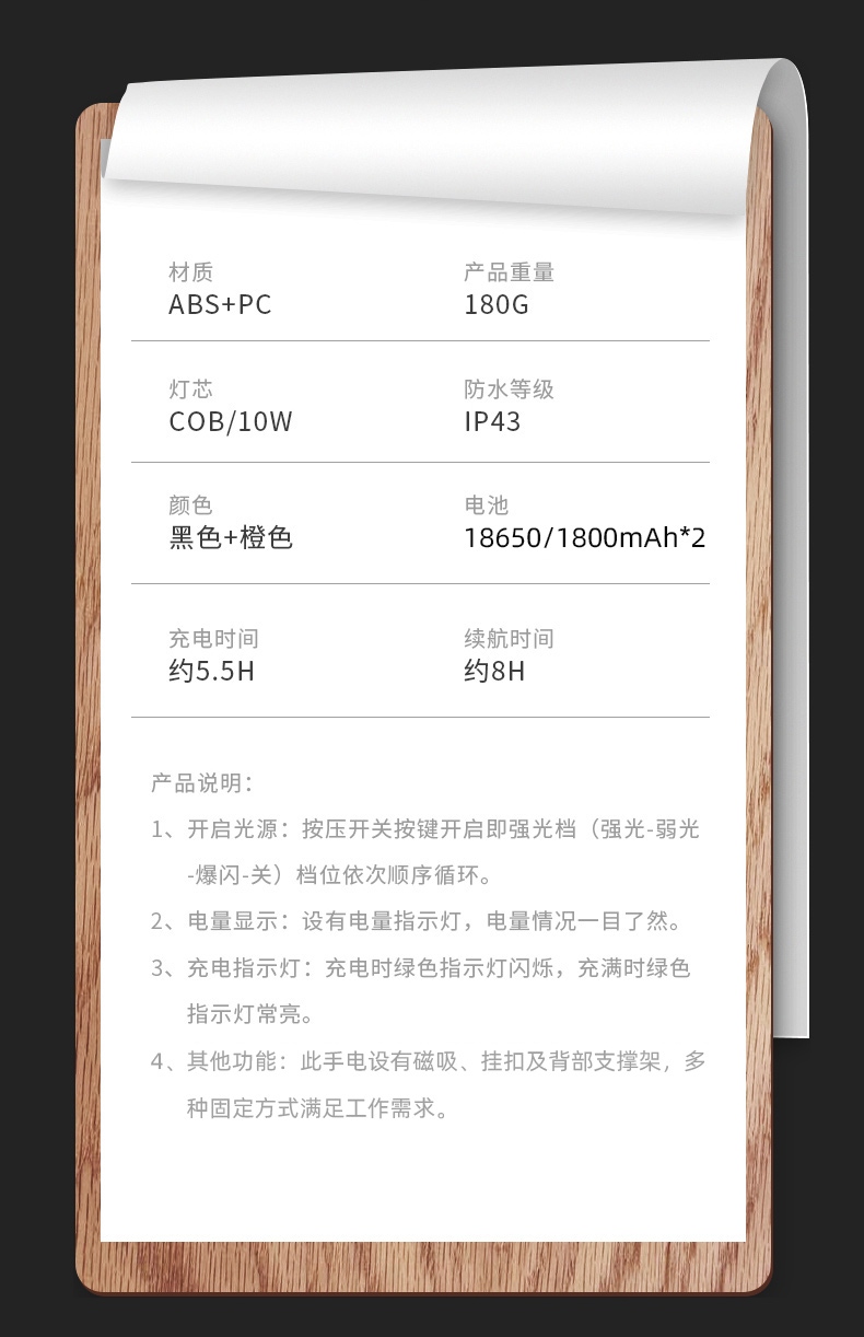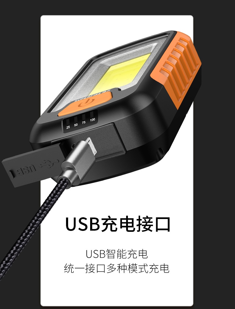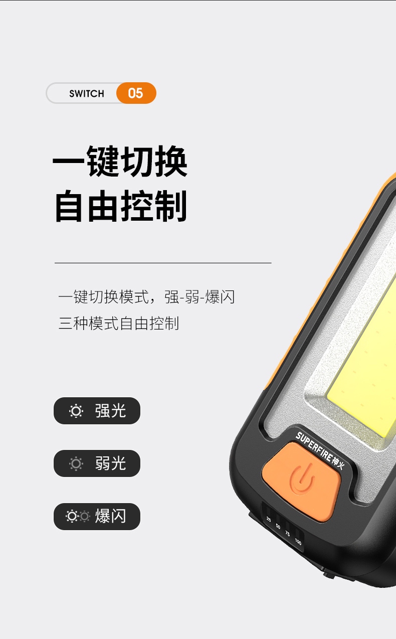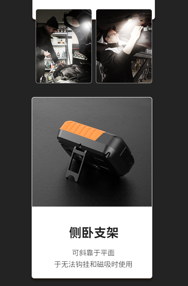 1.多功能工作燈,COB廣角照明; 2.此手電設(shè)有磁吸,掛扣及背部支撐架,多種固定方式滿足工作需求; 3.方便單手持握操作; 4.一鍵切換模式,四種模式自由控制; 5.設(shè)有電量指示燈,電量情況一目了然