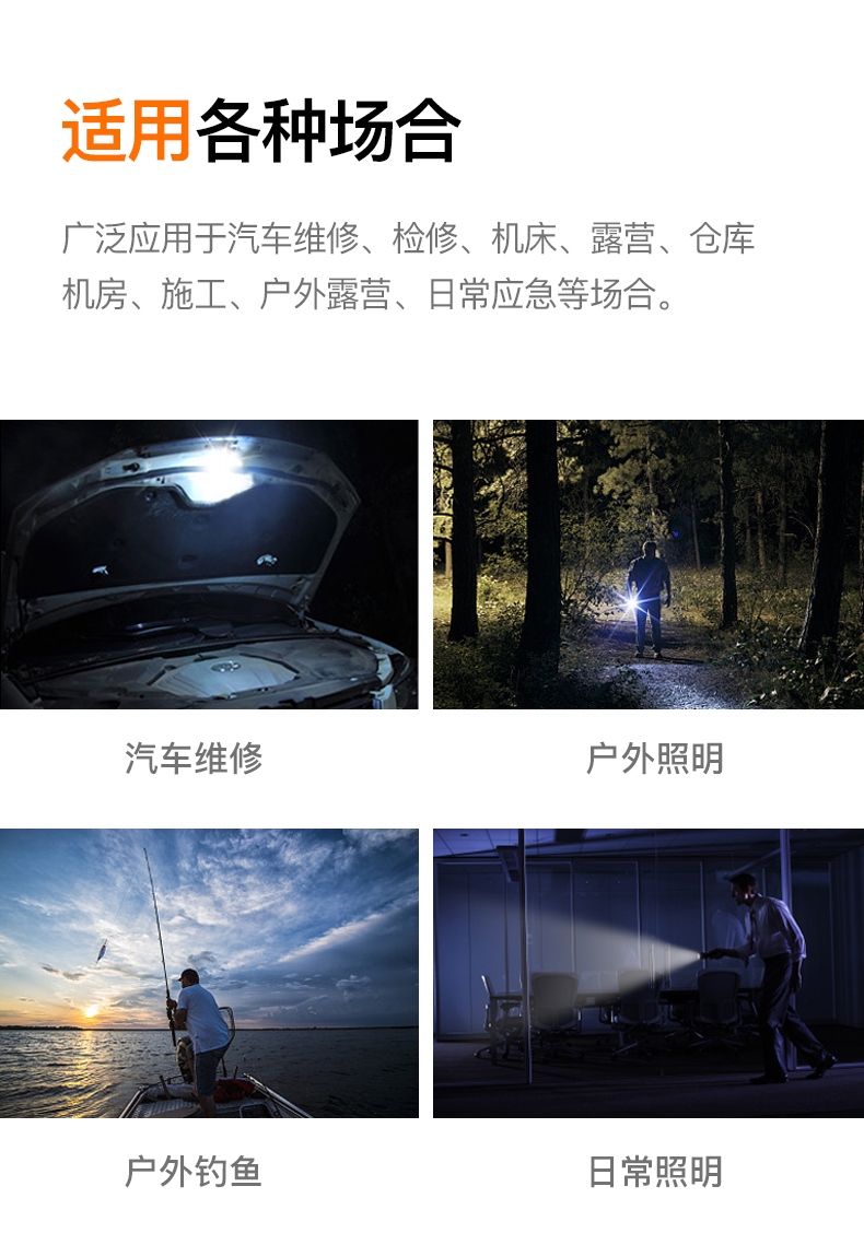 聚光主燈 亮度隨心 輕按后端開關按鈕,主燈強光點亮,續按依次切換主燈工作光-爆閃光。主燈開啟狀態下長按5秒,可實現光源色溫轉換。主燈關閉狀態下長按5秒,可開啟燈具最亮照明模式。 爆亮強光 亮如白晝 1500LM大功率高亮光源,點亮頃刻如白晝