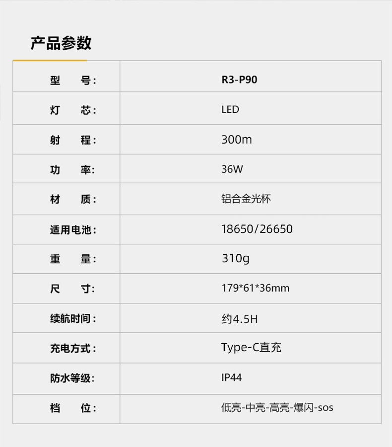 1、千米遠射,射程更遠,光斑更聚焦。 2、進口燈珠,亮度高,照明效果更好。 3、前后雙按鍵,光源一鍵點亮,高亮瞬間開啟。