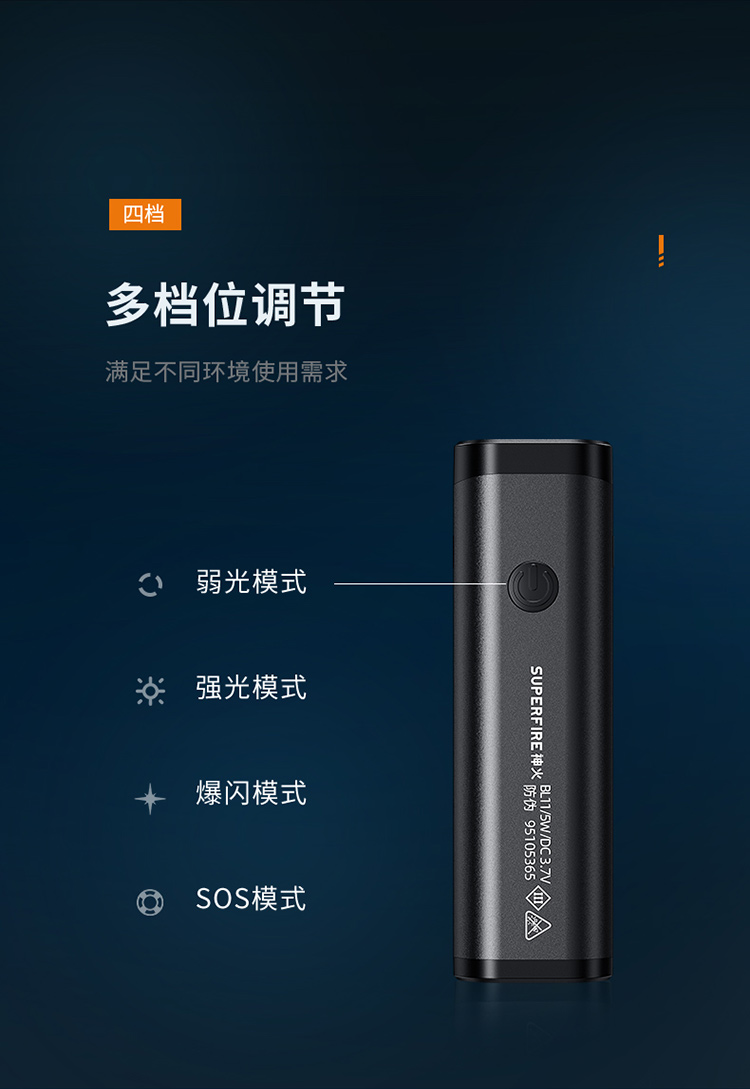 3.共四個檔位,長按可開啟SOS,再續按開啟爆閃模式;