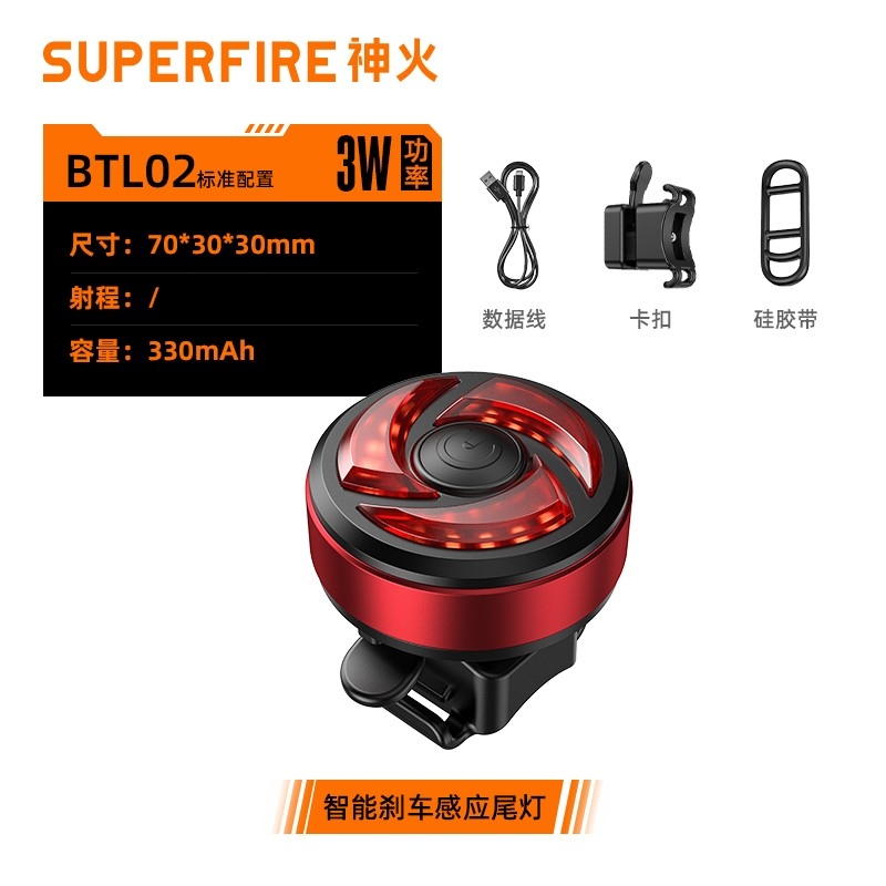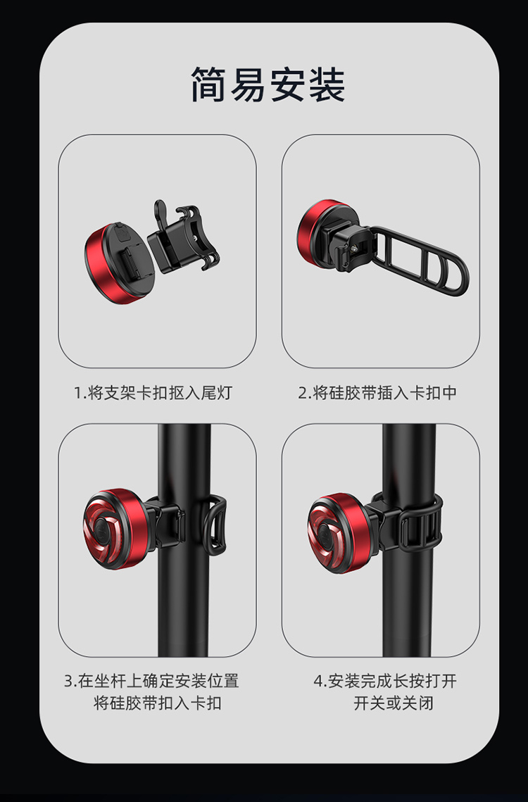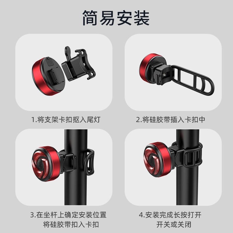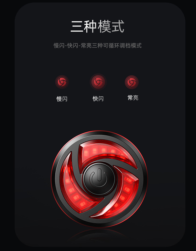 1、單按按鍵開啟光源,續按調檔以(慢閃-快閃-常亮)檔位順序循環; 2、充電時紅色指示燈燈常亮.充滿時紅色指示燈燈熄滅; 3、急剎智能感應,預防追尾,提升騎行安全; 4、生活防水,雨天正常使用,避免雨中事故; 5、設有USB充電接口