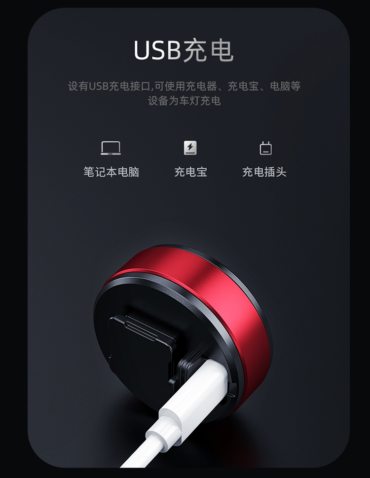 5、設有USB充電接口,可使用充電器、充電寶、電腦等設備為車燈充電。