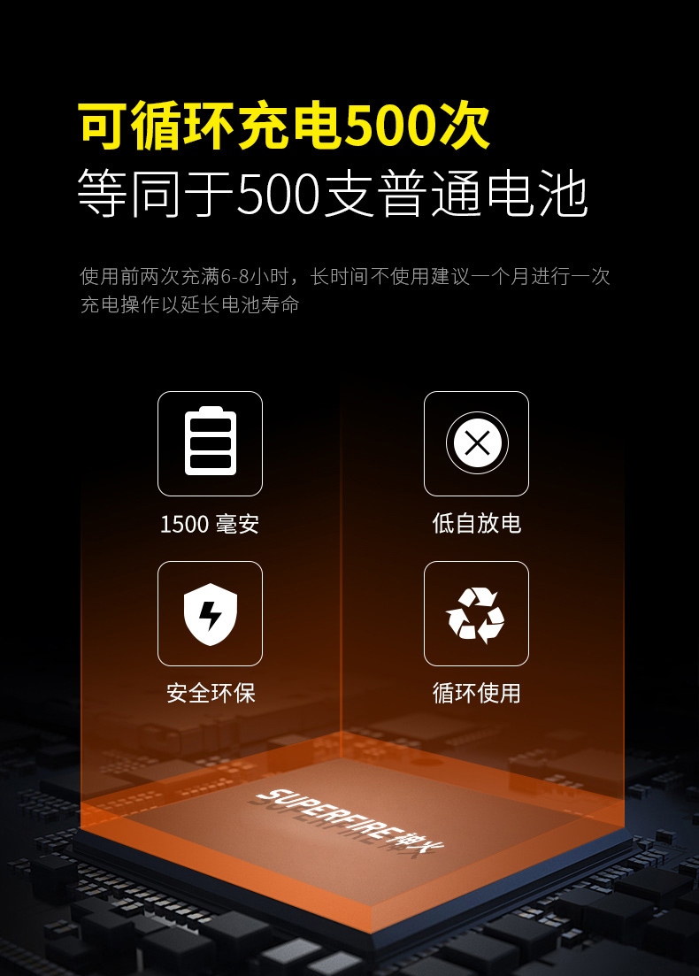 聚光主燈 亮度隨心 輕按后端開關按鈕,主燈強光點亮,續(xù)按依次切換主燈工作光-爆閃光。主燈開啟狀態(tài)下長按5秒,可實現(xiàn)光源色溫轉換。主燈關閉狀態(tài)下長按5秒,可開啟燈具最亮照明模式。 爆亮強光 亮如白晝 1500LM大功率高亮光源,點亮頃刻如白晝