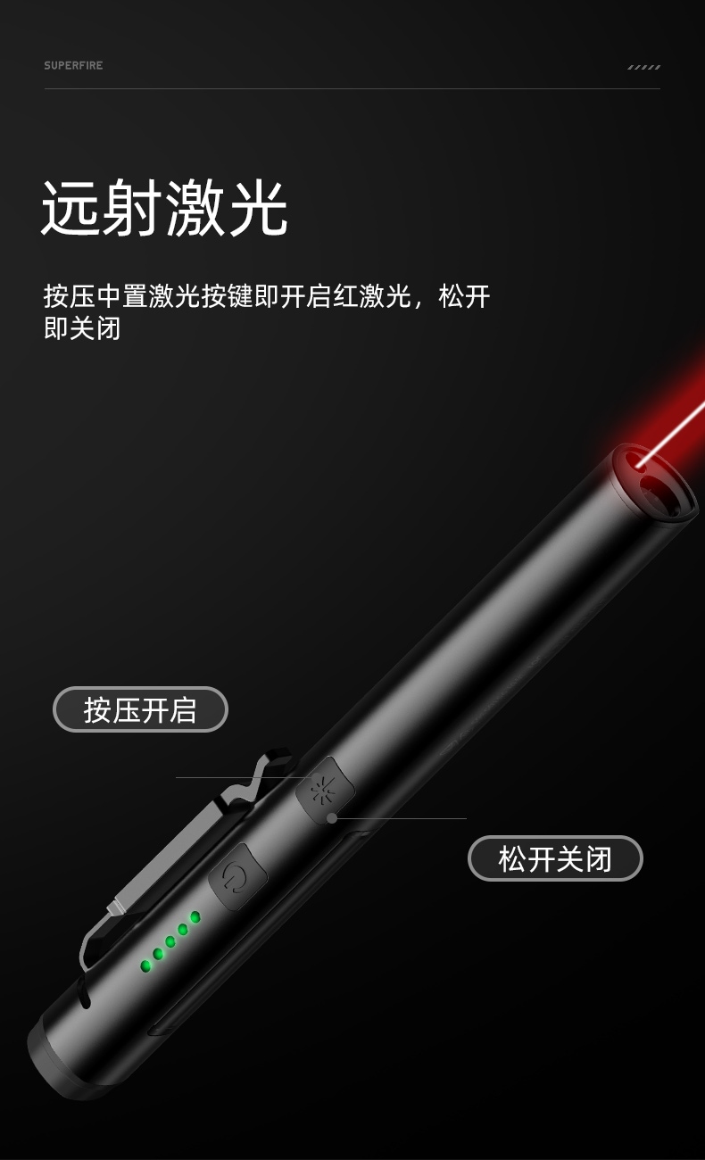 3、點按中置激光按鍵即開啟紅激光,松開即關閉。