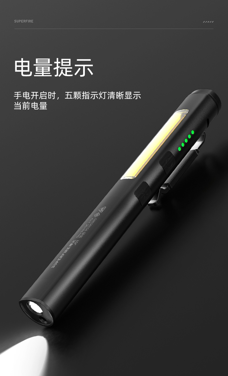 1.單擊左邊開關開啟感應功能,同時開啟強光檔,續按關閉感應功能(關閉感應功能,光源不會關閉),當感應功能開啟時,單擊右邊開關可正常調節檔位。 2.多樣化充電,使用方便:設有Type-c充電口,可使用充電器、充電寶、電腦等設備為燈具充電。 3.電量顯示:實時