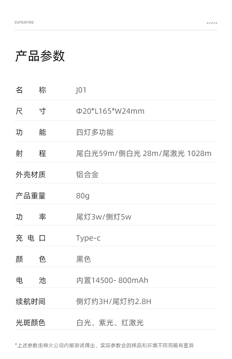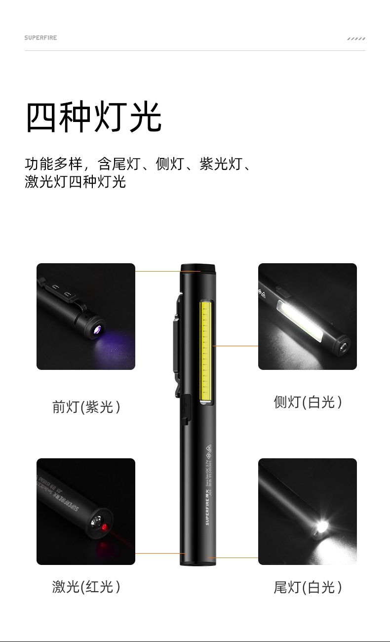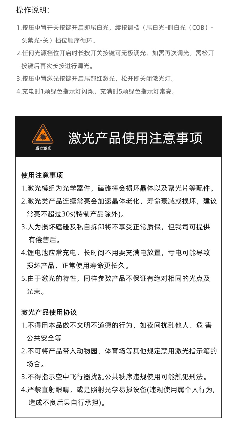 1、功能多樣,含前燈、側燈、紫光燈、激光燈四種燈光。 2、按壓中置開關按鍵開啟即尾白光,續按調檔(尾白光-側白光(COB)-頭紫光-關)檔位順序循環,且可進行無極調光。 3、點按中置激光按鍵即開啟紅激光,松開即關閉。