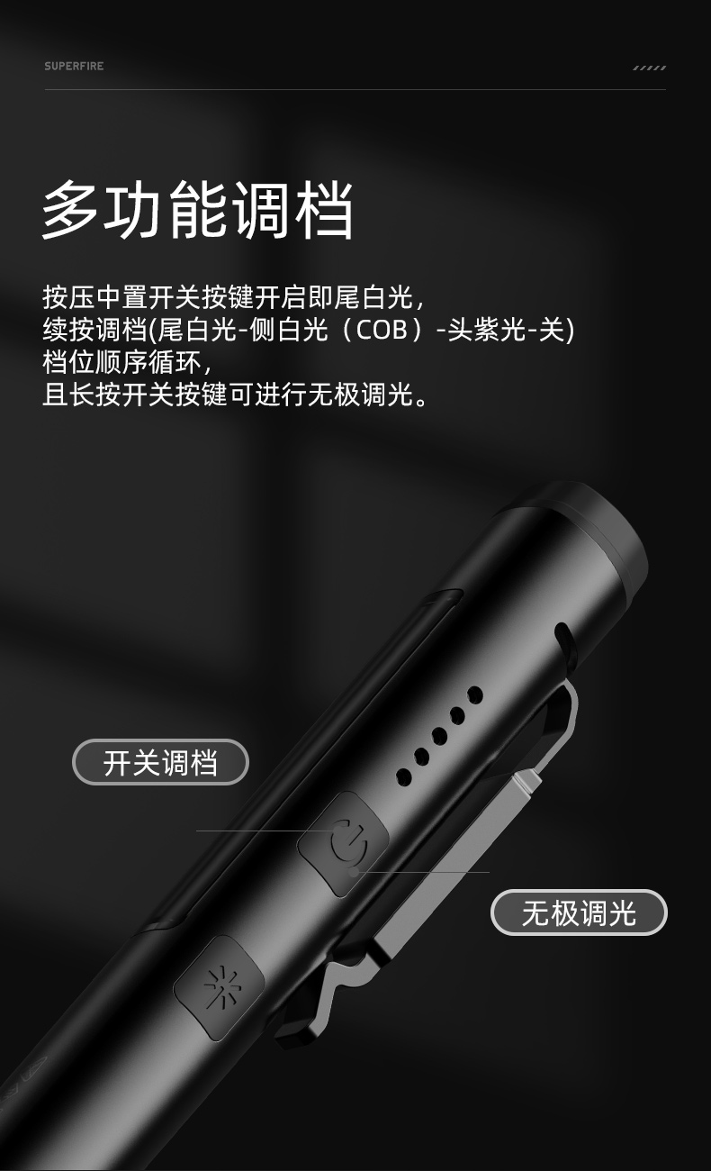 2、按壓中置開關按鍵開啟即尾白光,續按調檔(尾白光-側白光(COB)-頭紫光-關)檔位順序循環,且可進行