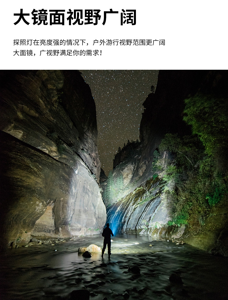 聚光主燈 亮度隨心 輕按后端開關按鈕,主燈強光點亮,續按依次切換主燈工作光-爆閃光。主燈開啟狀態下長按5秒,可實現光源色溫轉換。主燈關閉狀態下長按5秒,可開啟燈具最亮照明模式。 爆亮強光 亮如白晝 1500LM大功率高亮光源,點亮頃刻如白晝