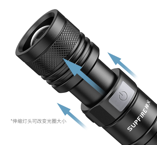 手電采用了伸縮調焦設計,推拉燈頭即可輕松實現聚光和泛光的轉換,可兼顧遠泛。聚光射程較遠,光束強勁;泛光照射范圍廣,照明清晰。