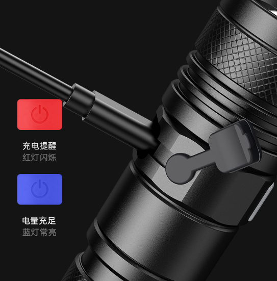 與按鈕對稱的則是防塵膠塞嚴密包裹著的TYPE-C充電口。出廠標配了1顆2200mAh的18650大容量鋰離子電池,可強光續航2.5h。