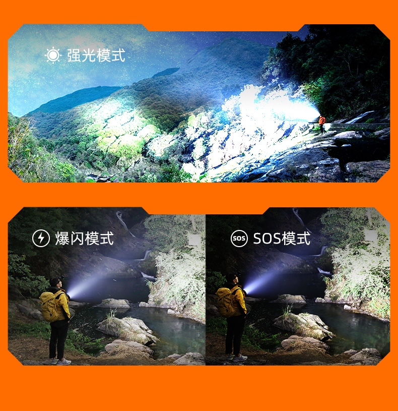 聚光主燈 亮度隨心 輕按后端開關按鈕,主燈強光點亮,續按依次切換主燈工作光-爆閃光。主燈開啟狀態下長按5秒,可實現光源色溫轉換。主燈關閉狀態下長按5秒,可開啟燈具最亮照明模式。 爆亮強光 亮如白晝 1500LM大功率高亮光源,點亮頃刻如白晝
