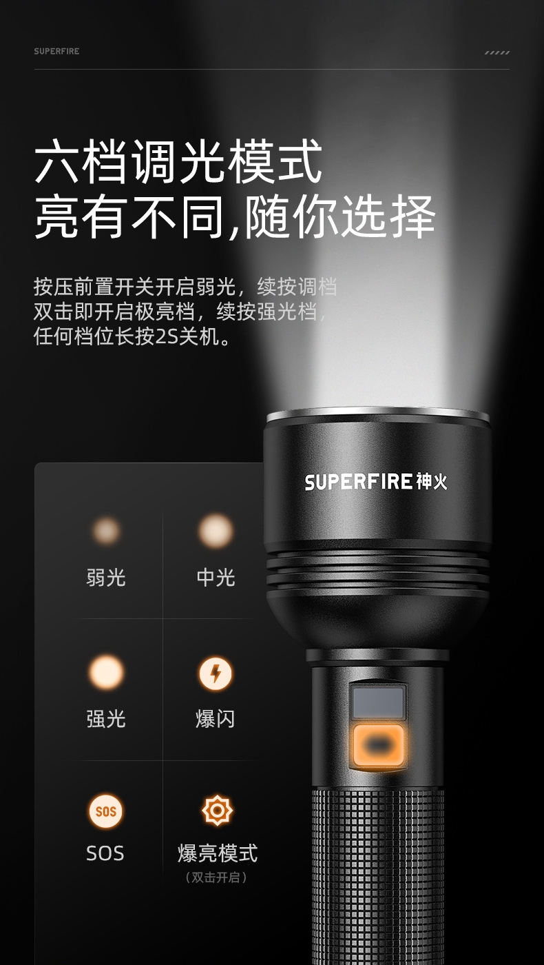 1、六檔調(diào)光,可滿足不同使用場(chǎng)景下的照明需求。 2、進(jìn)口高亮朗明納斯燈珠,照明效果更好。 3、含檔位記憶,任意檔位快捷關(guān)機(jī) ,開機(jī)恢復(fù)關(guān)機(jī)前檔位。
