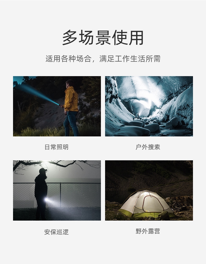 聚光主燈 亮度隨心 輕按后端開關(guān)按鈕,主燈強(qiáng)光點(diǎn)亮,續(xù)按依次切換主燈工作光-爆閃光。主燈開啟狀態(tài)下長(zhǎng)按5秒,可實(shí)現(xiàn)光源色溫轉(zhuǎn)換。主燈關(guān)閉狀態(tài)下長(zhǎng)按5秒,可開啟燈具最亮照明模式。 爆亮強(qiáng)光 亮如白晝 1500LM大功率高亮光源,點(diǎn)亮頃刻如白晝