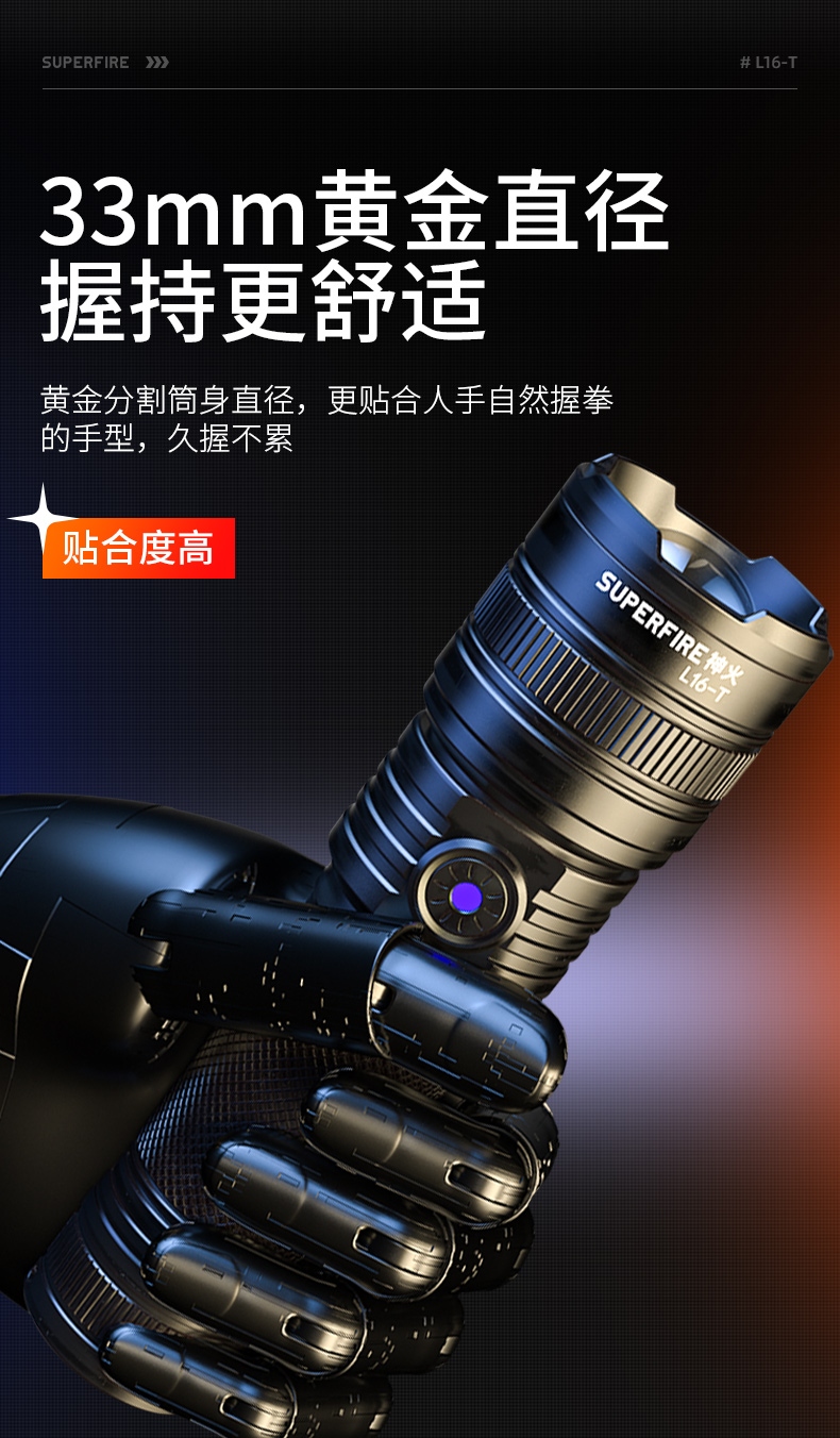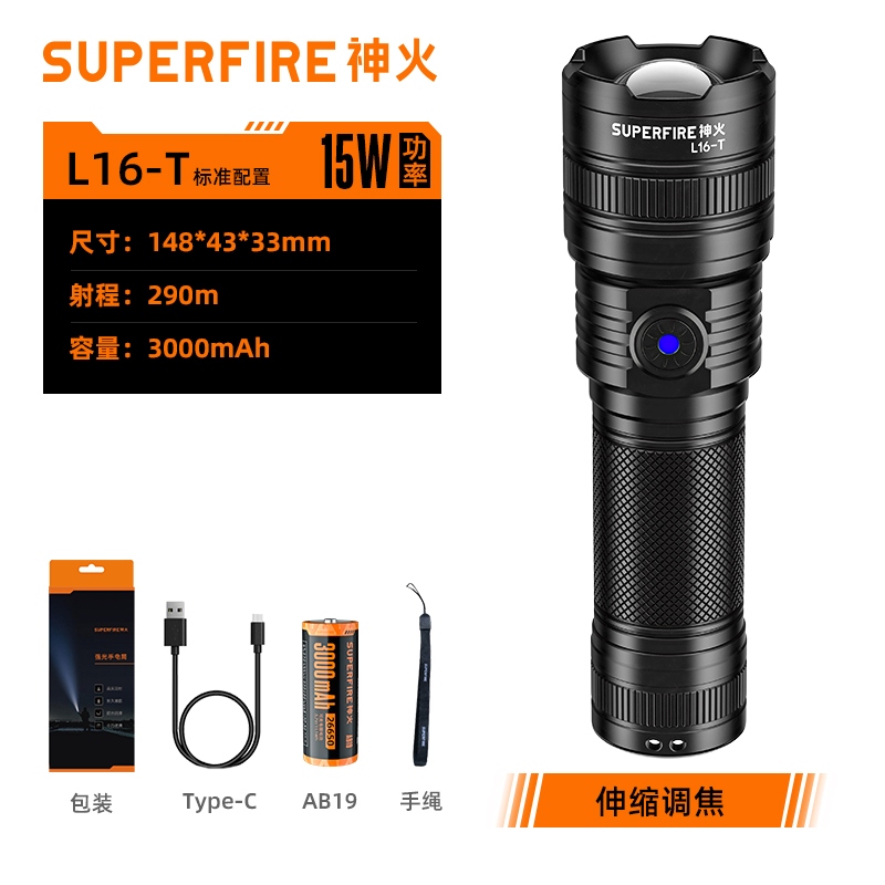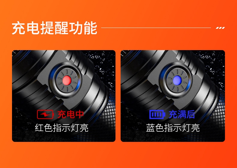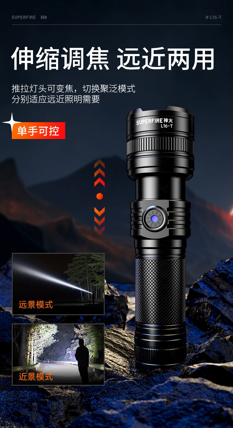 1、伸縮調焦可調節光圈大小和聚泛模式,滿足不同的照明需求; 2、采用圓形光斑光色更自然圓潤無雜光; 3、TYPE-C直充接口更便捷,可適用于市面上大部分充電端口; 4、充電指示,充電中亮紅色指示燈,充滿亮藍色指示燈; 5、電池多樣化,可兼容26650電池和18