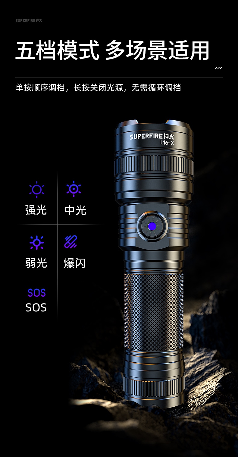 1、多檔調(diào)光,滿足不同環(huán)境下使用需求。 2、鋁合金筒身,防水耐摔。 3、推拉燈頭可實(shí)現(xiàn)伸縮調(diào)焦。