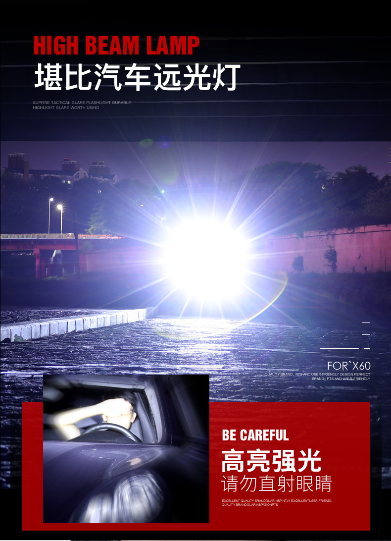 1、大尺寸鋁合金光杯,光斑更圓潤。 2、新型高亮遠射燈珠,40W大功率,亮度高,照明效果好。