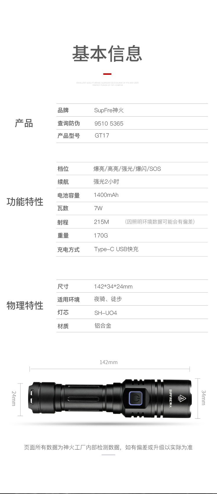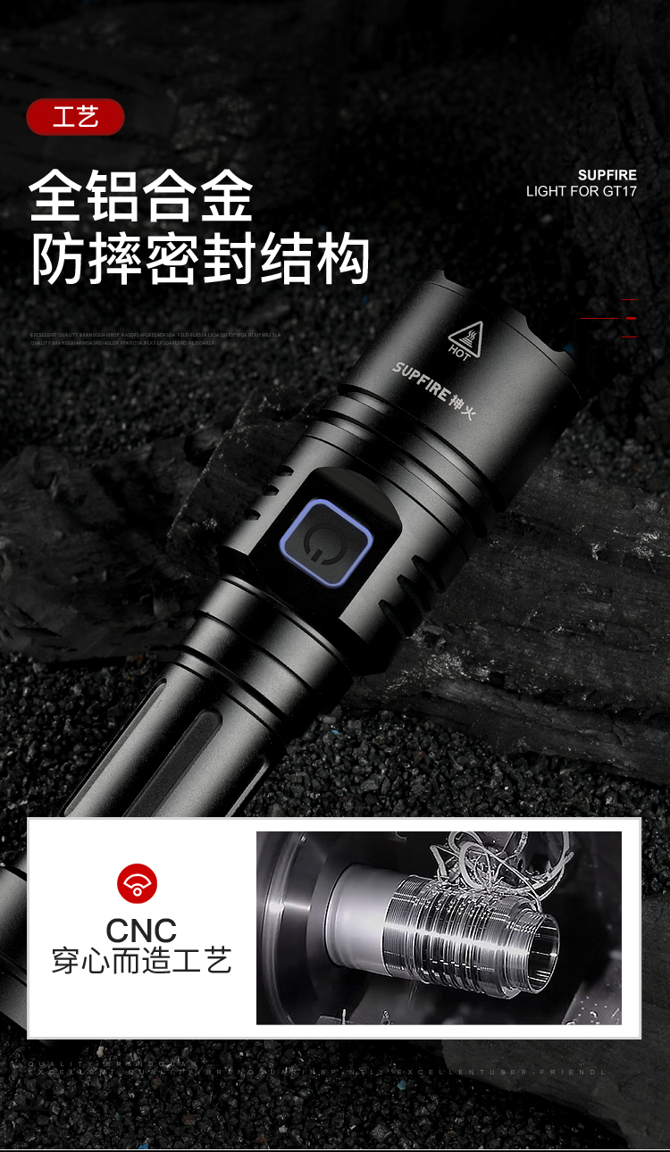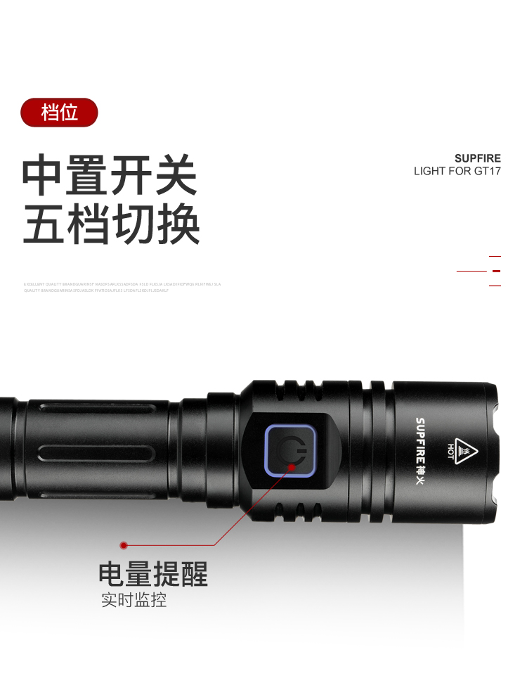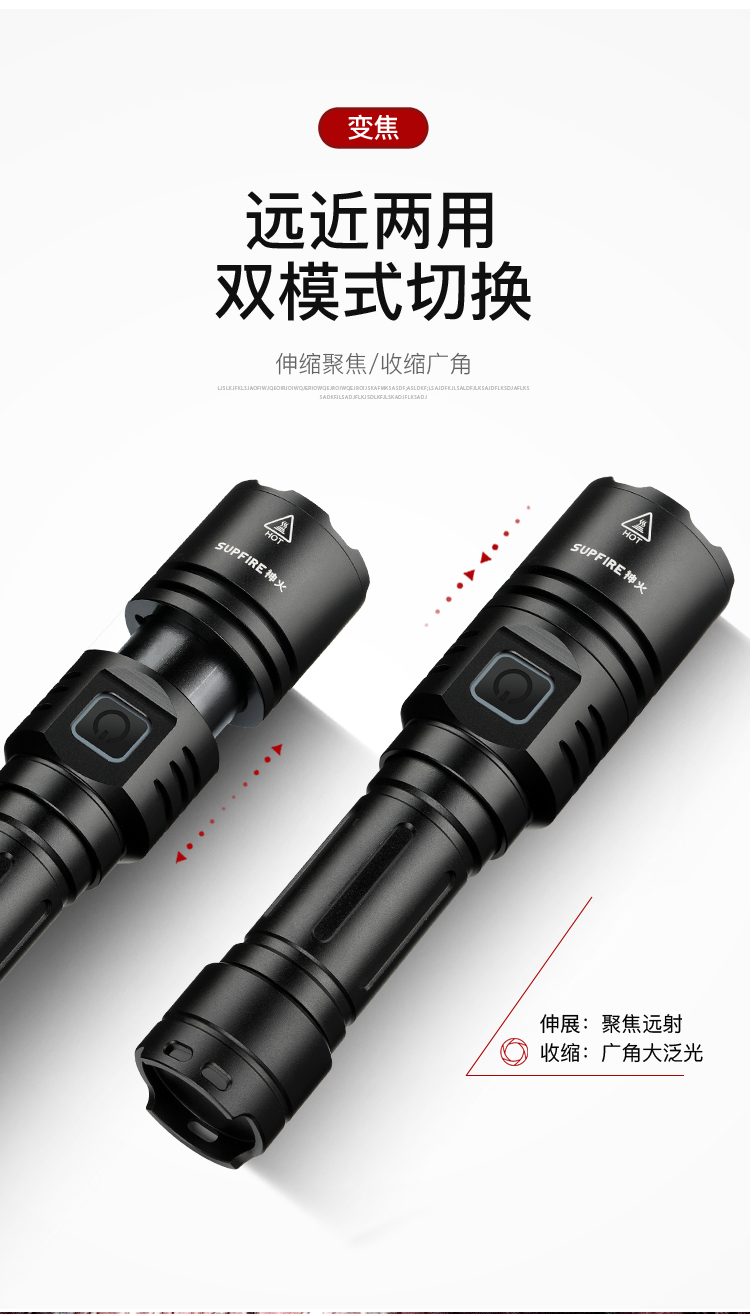 1、伸縮調焦遠近兩用,適用各種場景。 2、中置開關,五檔調節,一鍵切換更方便 3、多樣化充電,使用方便:設有Type-C充電口,可使用充電器、電腦等設備為手電充電。