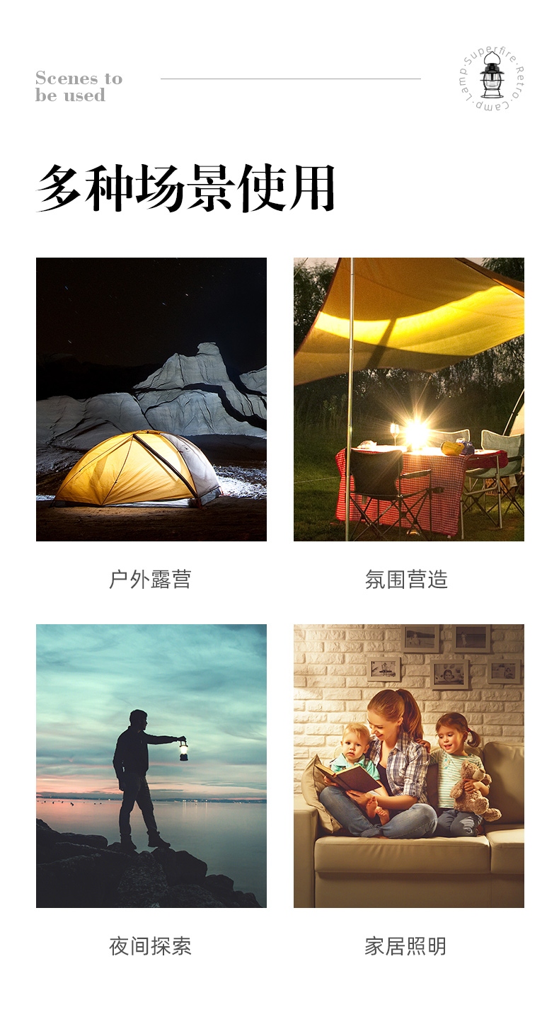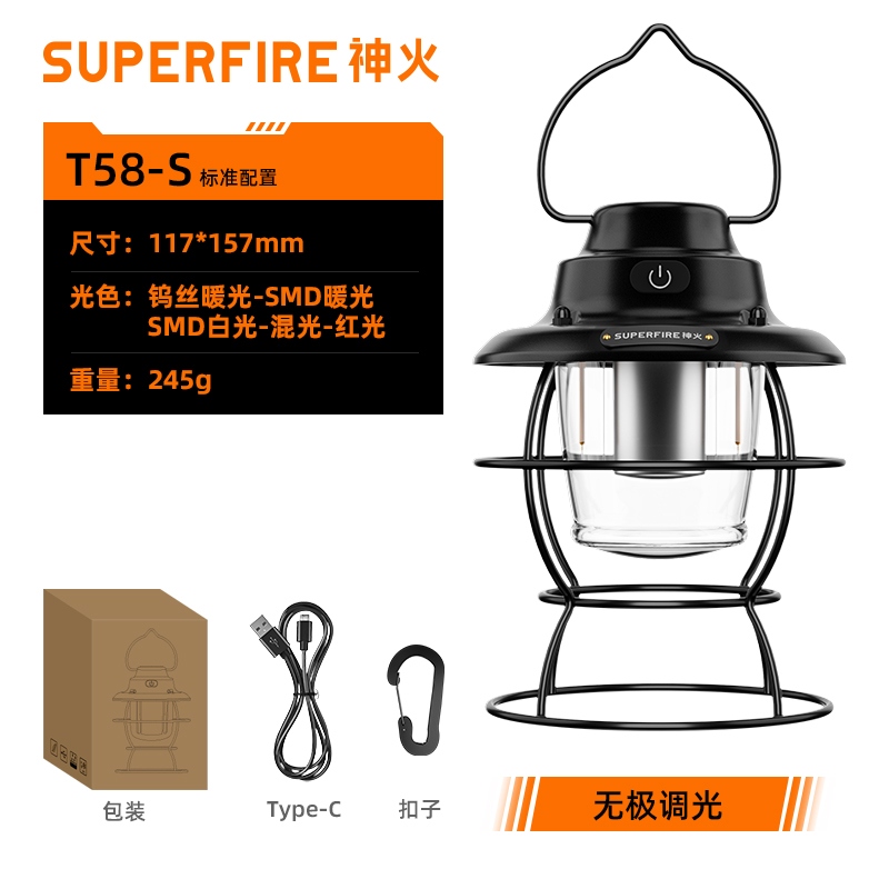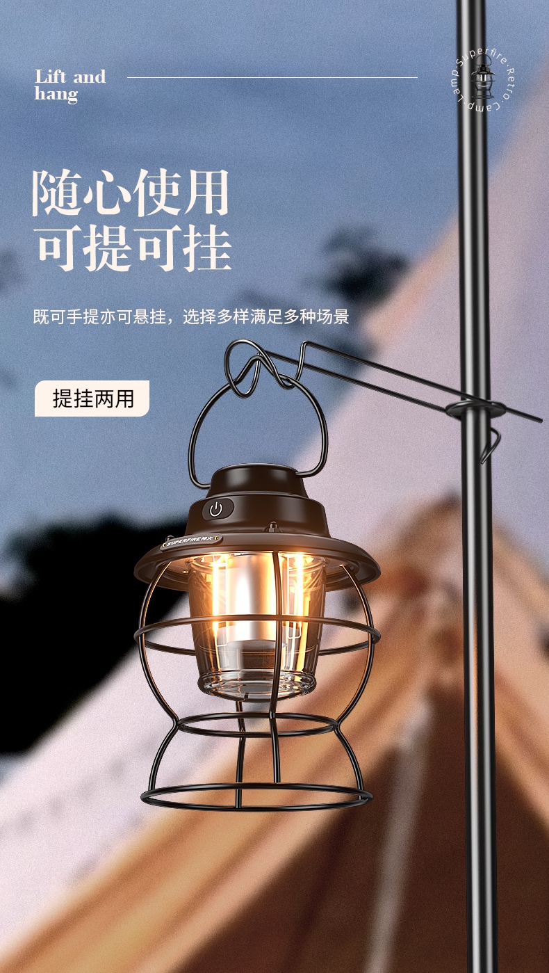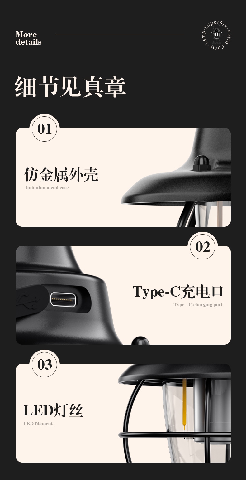 1.長按無極調光,單擊切換光源::鎢絲暖光-SMD暖光-SMD白光-混合光。 2.雙擊切換紅光:紅光亮-紅光閃-紅光SOS。 3.配有小TYPE-C輸入接口,充電方便。充電時可邊充電邊使用照明功能。 4.產品帶有提手和掛鉤,可手提使用相當方便。