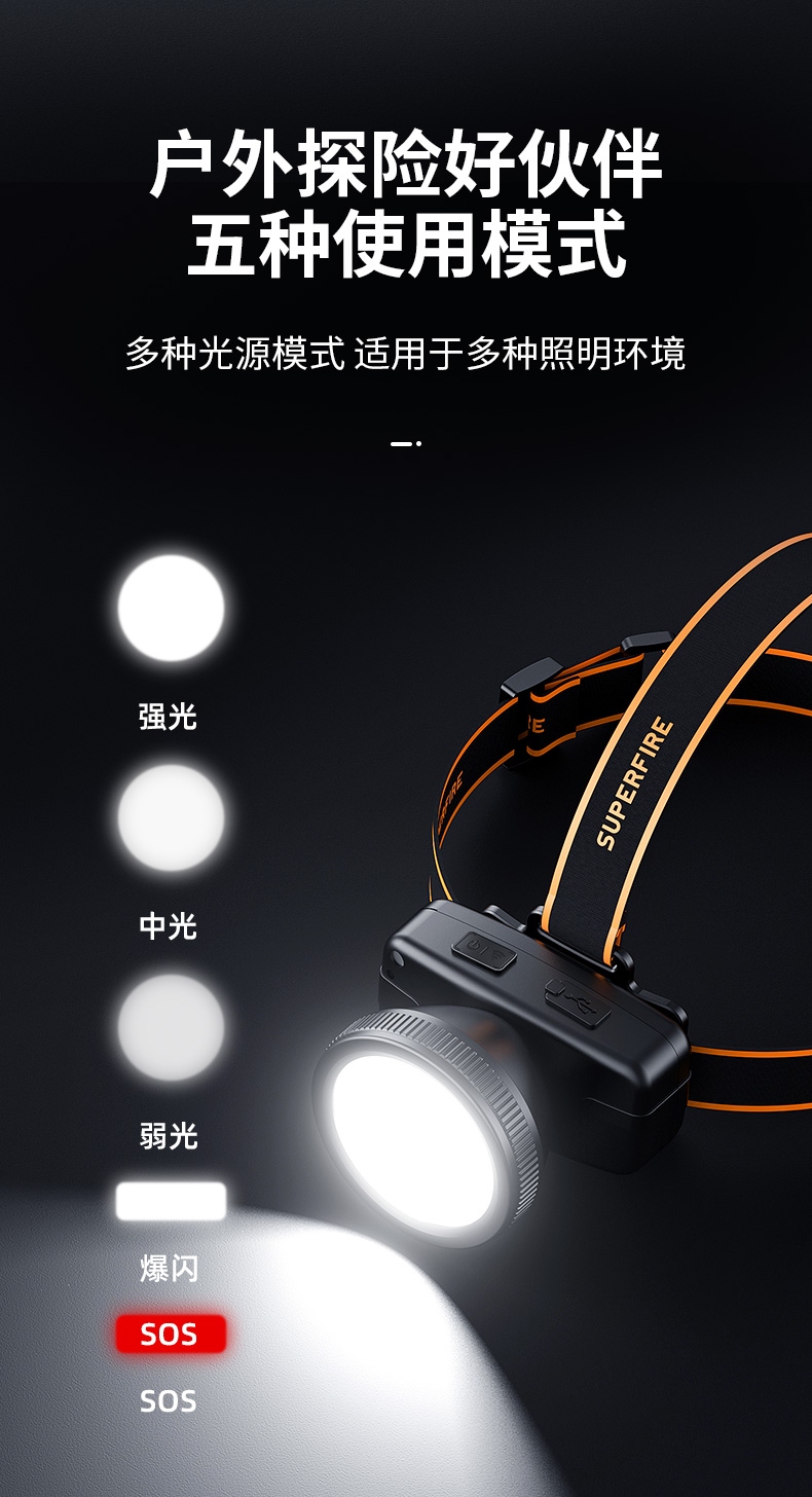 強光亮度,運動頭燈,前后均衡設計,輕便不壓頭,可調節式頭燈帶,佩戴方便舒適,伸縮調焦,光照范圍大,照射距離遠,頭燈角度調節,超90度角度隨意調節,適宜各種環境使用