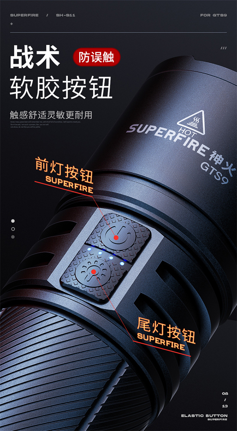 1、千米遠(yuǎn)射,射程更遠(yuǎn),光斑更聚焦。 2、進(jìn)口燈珠,亮度高,照明效果更好。 3、前后雙按鍵,光源一鍵點(diǎn)亮,高亮瞬間開(kāi)啟。