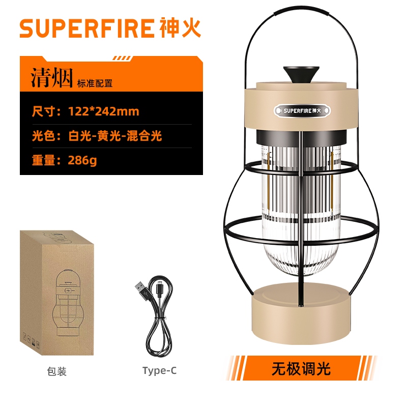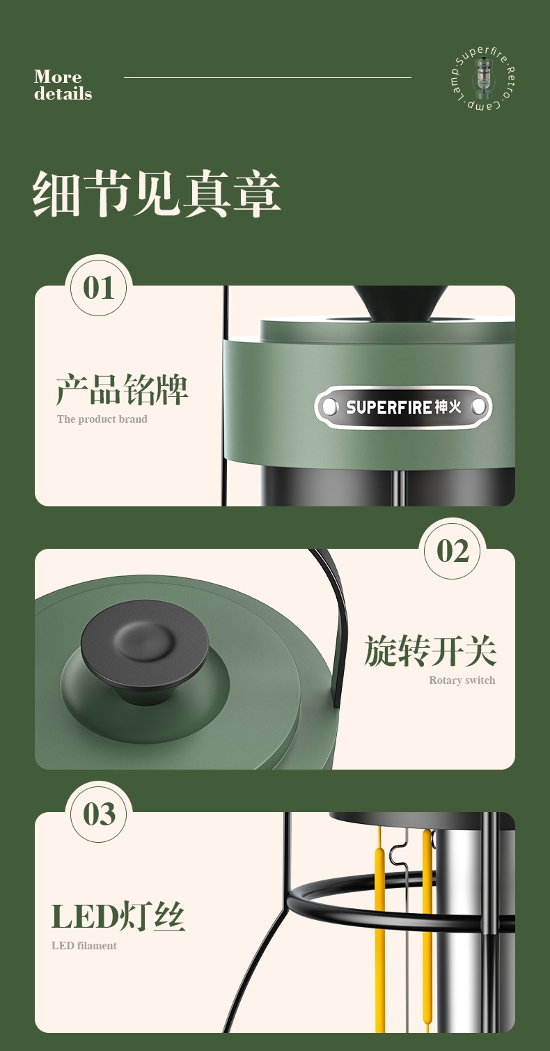 1.順時針旋轉頂部開關旋鈕開啟光源,以黃光(低亮至高亮)-白光(低亮至高亮)-黃+白光的順序選擇光色及亮度。 2.充電時1顆藍色指示燈閃爍;充滿時4顆藍色指示燈常亮。 3.配有小TYPE-C輸入接口,充電方便。充電時可邊充電邊使用照明功能。