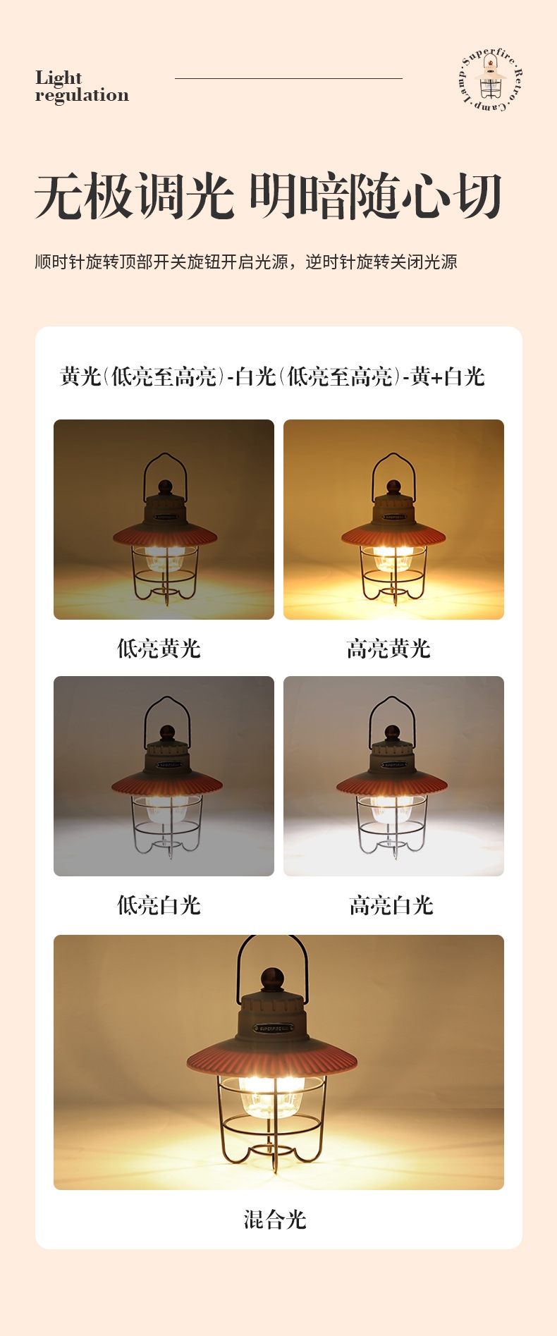 1、六檔調光,可滿足不同使用場景下的照明需求。 2、進口高亮朗明納斯燈珠,照明效果更好。 3、含檔位記憶,任意檔位快捷關機 ,開機恢復關機前檔位。
