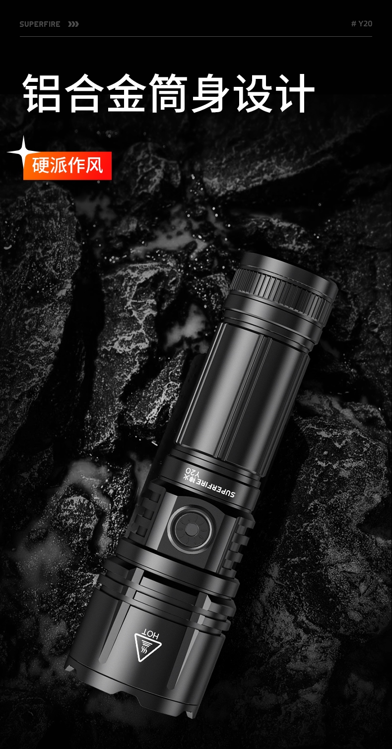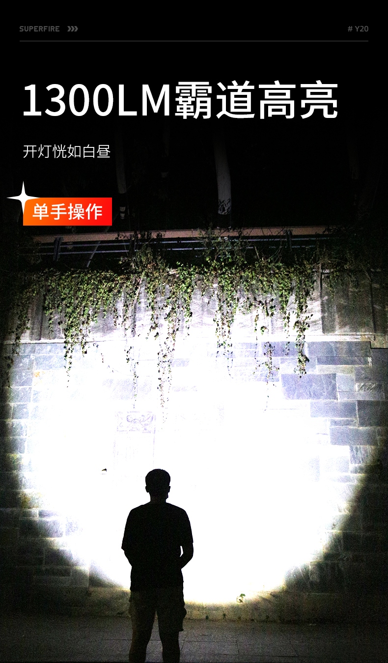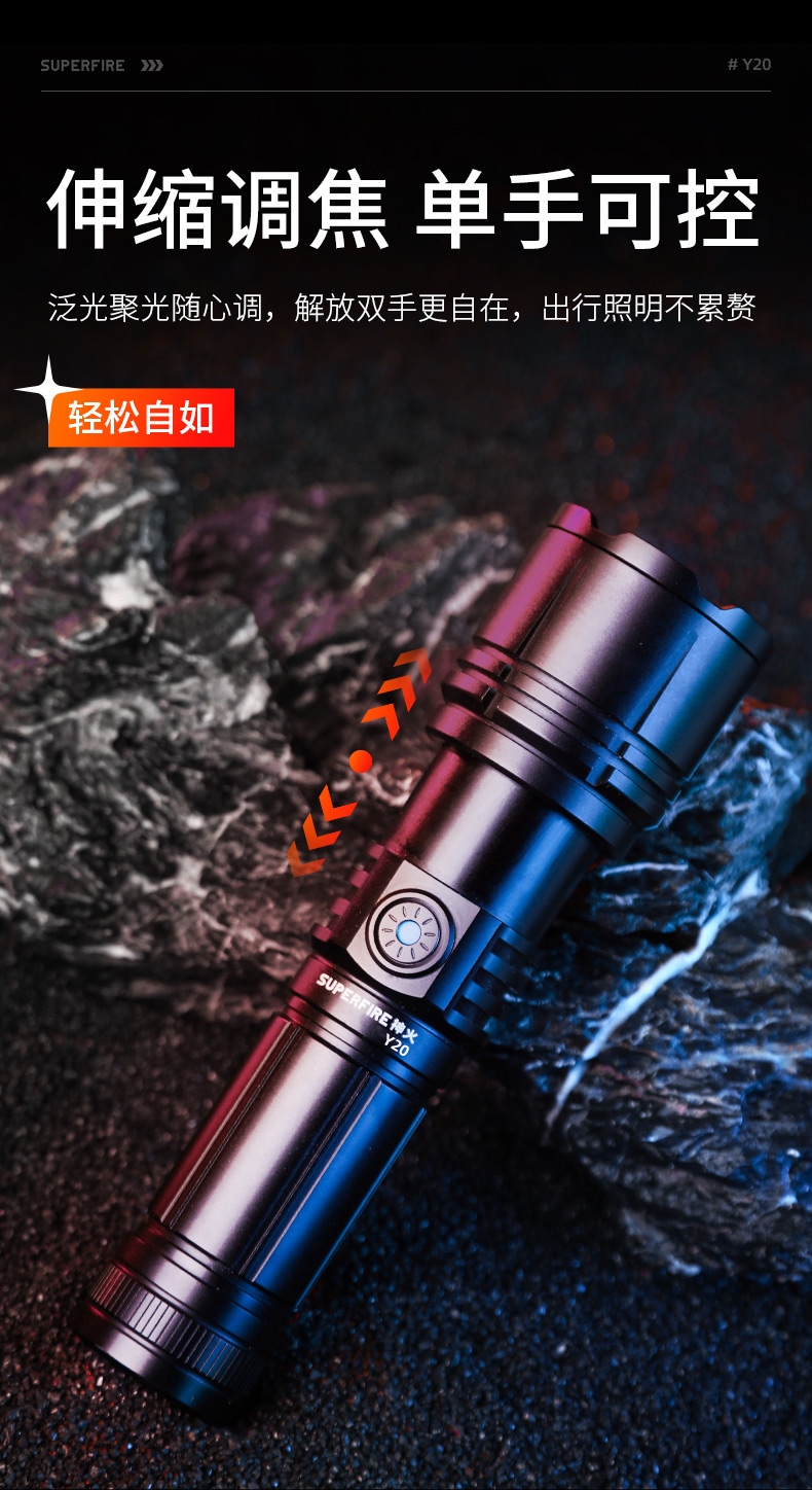 1、強光遠射,最大照射距離700m,20W全新高亮遠射燈珠,射程遠,照明效果更好。 2、伸縮調(diào)焦,單手可控。 3、雙模式照明,含檔位記憶,一樣的簡單操作,不一樣的使用體驗。