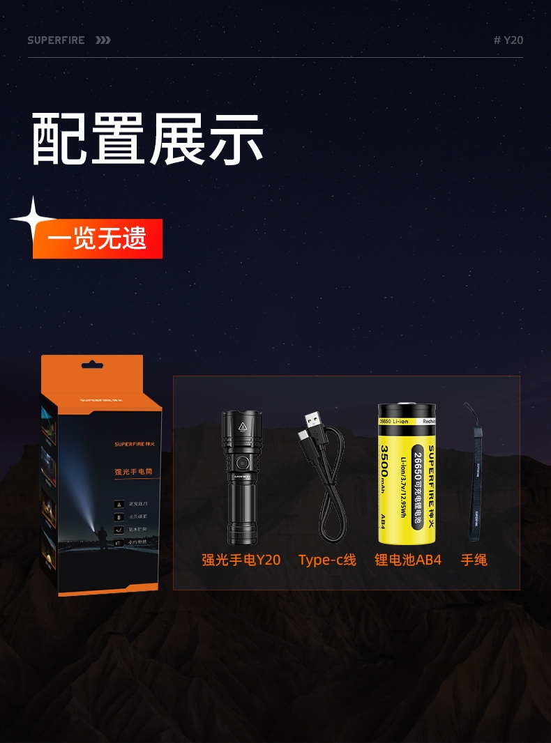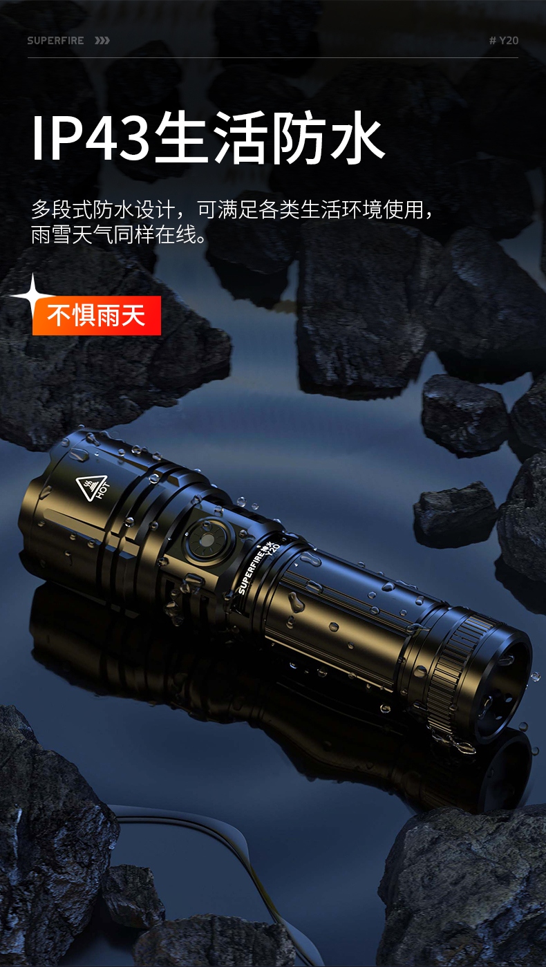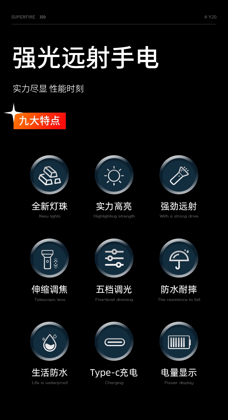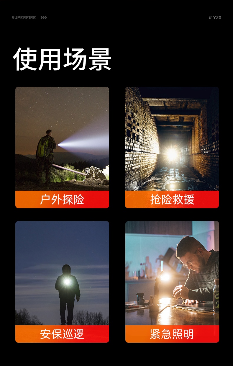 1、強光遠射,最大照射距離700m,20W全新高亮遠射燈珠,射程遠,照明效果更好。 2、伸縮調(diào)焦,單手可控。 3、雙模式照明,含檔位記憶,一樣的簡單操作,不一樣的使用體驗。