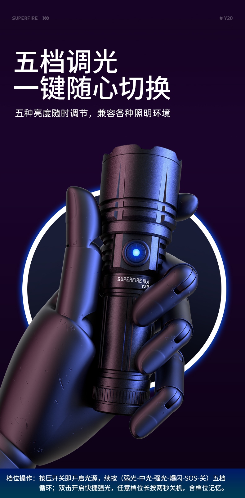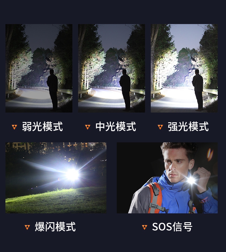8、多檔調(diào)光(弱-中-強/SOS-爆閃),可滿足不同場景下的使用需求
