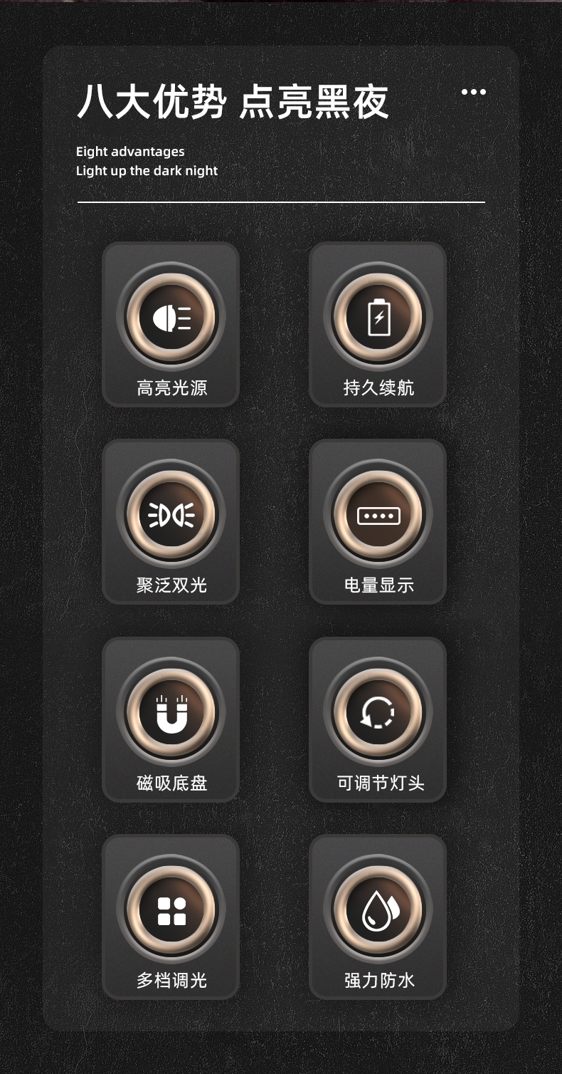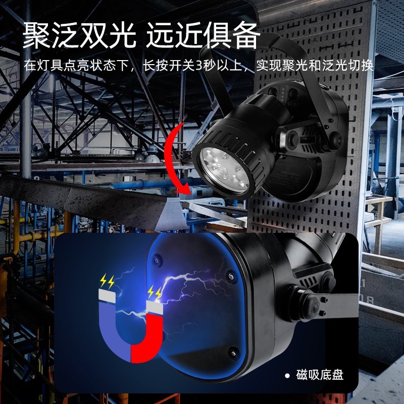 IP66級別優質防水 不懼雨天潮濕 磁吸底盤輕松固定 可調節燈頭更自在 電量分段指示 實況電量一眼便知 續航長達80h 怪獸級續航無憂照明 多種照明模式 聚泛雙光 遠近具備 爆亮強光 亮如白晝