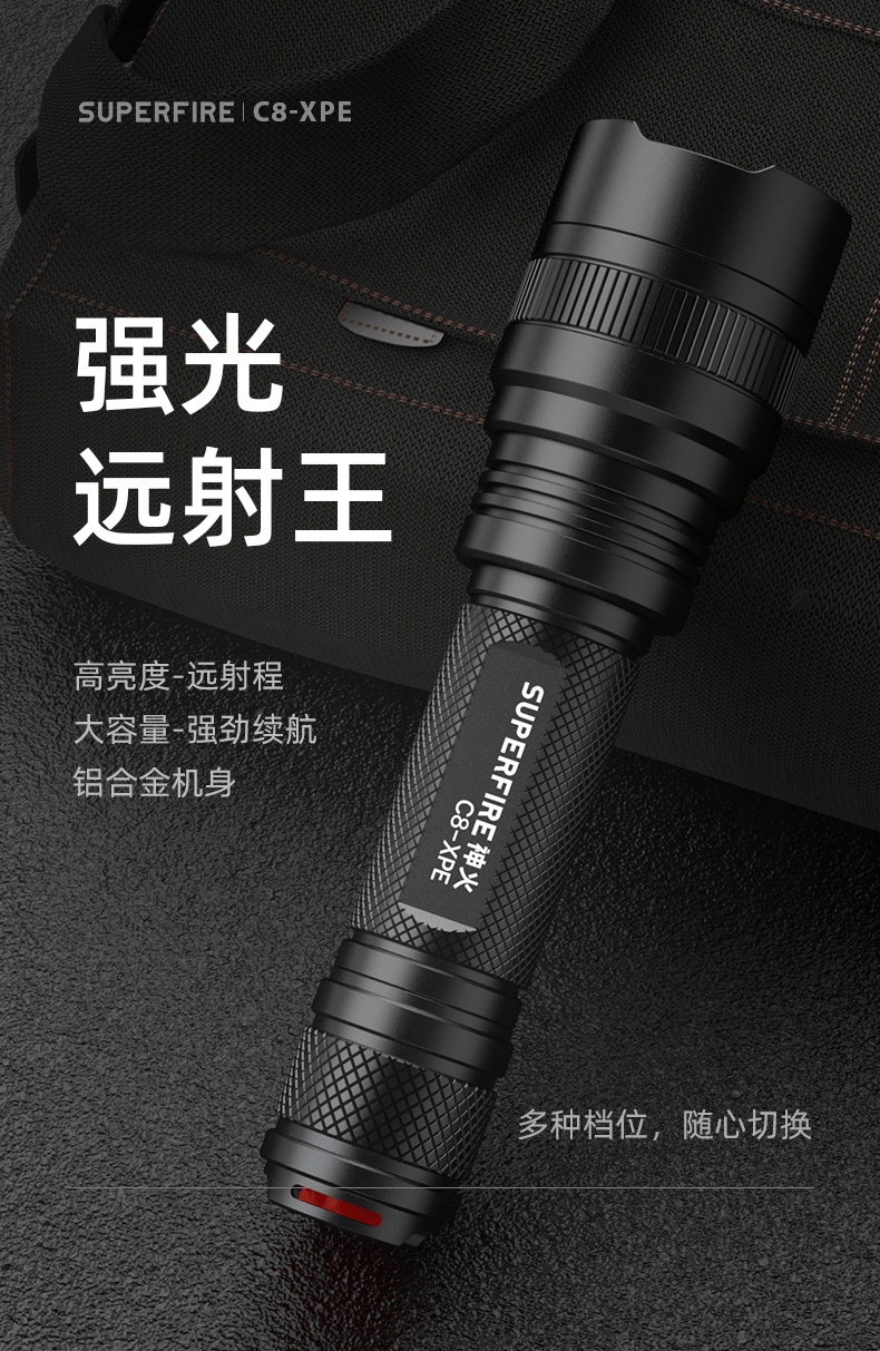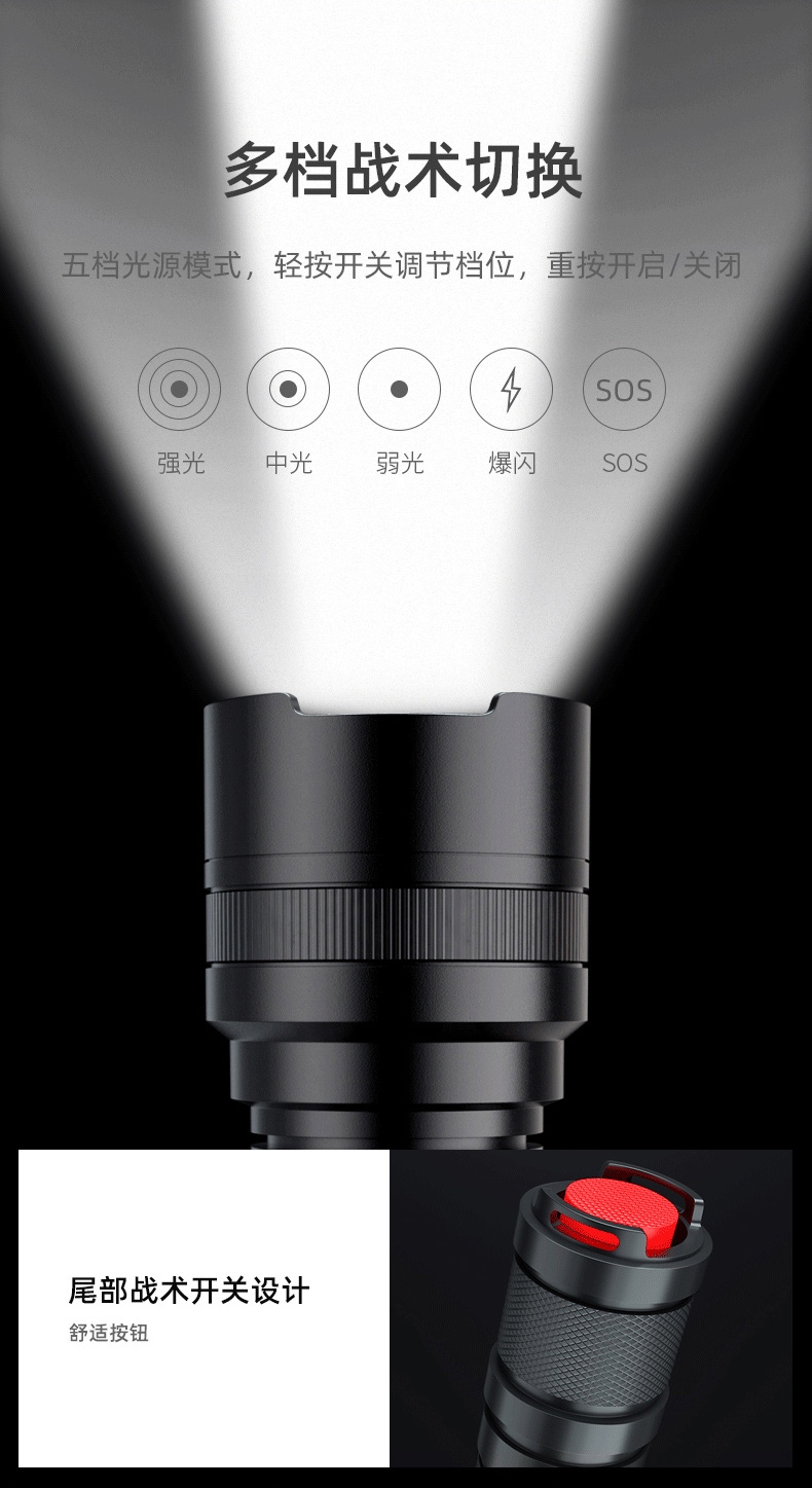 1、千米遠射,射程更遠,光斑更聚焦。 2、進口燈珠,亮度高,照明效果更好。 3、前后雙按鍵,光源一鍵點亮,高亮瞬間開啟。