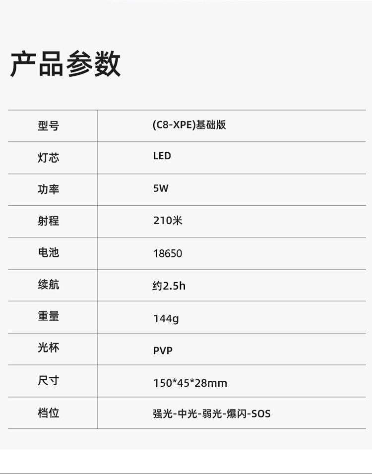 聚光主燈 亮度隨心 輕按后端開關按鈕,主燈強光點亮,續按依次切換主燈工作光-爆閃光。主燈開啟狀態下長按5秒,可實現光源色溫轉換。主燈關閉狀態下長按5秒,可開啟燈具最亮照明模式。 爆亮強光 亮如白晝 1500LM大功率高亮光源,點亮頃刻如白晝