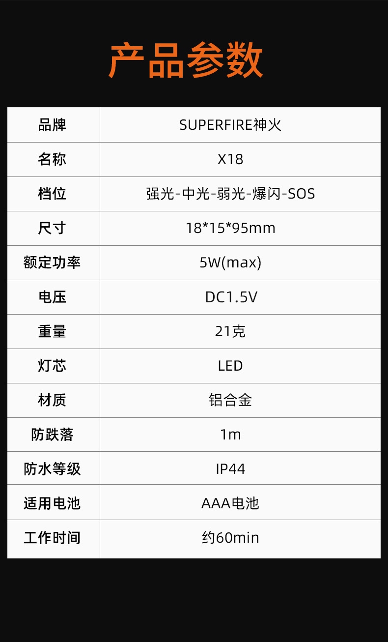聚光主燈 亮度隨心 輕按后端開關按鈕,主燈強光點亮,續按依次切換主燈工作光-爆閃光。主燈開啟狀態下長按5秒,可實現光源色溫轉換。主燈關閉狀態下長按5秒,可開啟燈具最亮照明模式。 爆亮強光 亮如白晝 1500LM大功率高亮光源,點亮頃刻如白晝