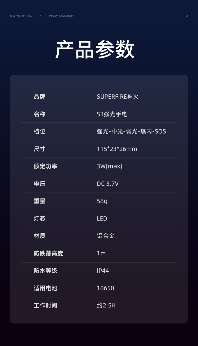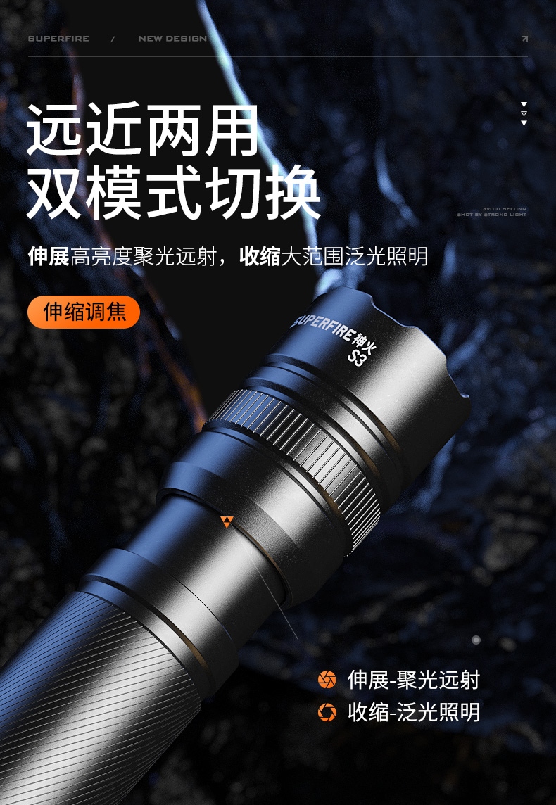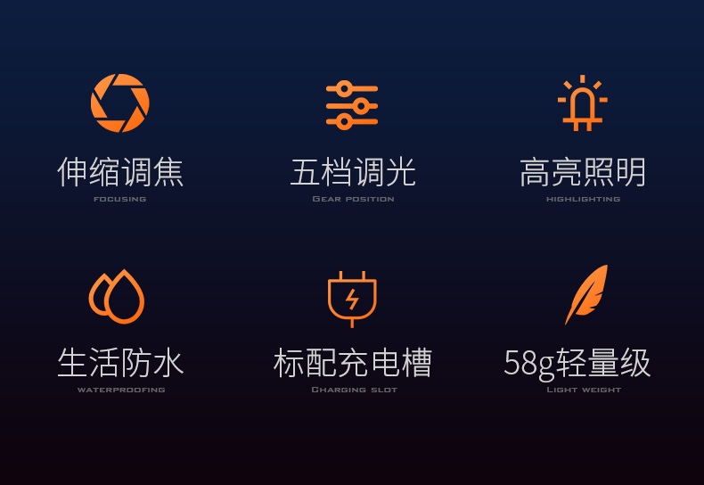 1、多檔調光、可滿足不同場景下的使用需求 2、專利外觀,時尚精致,小巧便攜。 3、伸縮調焦、聚泛隨心。 4、鋁合金筒身、防摔抗擊