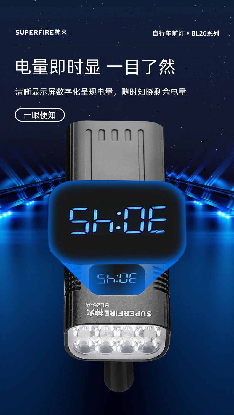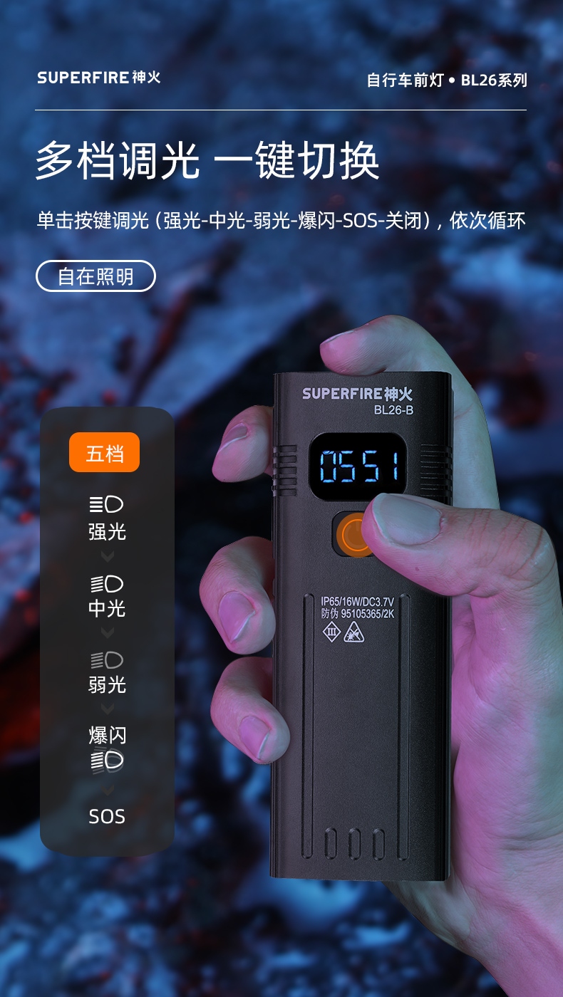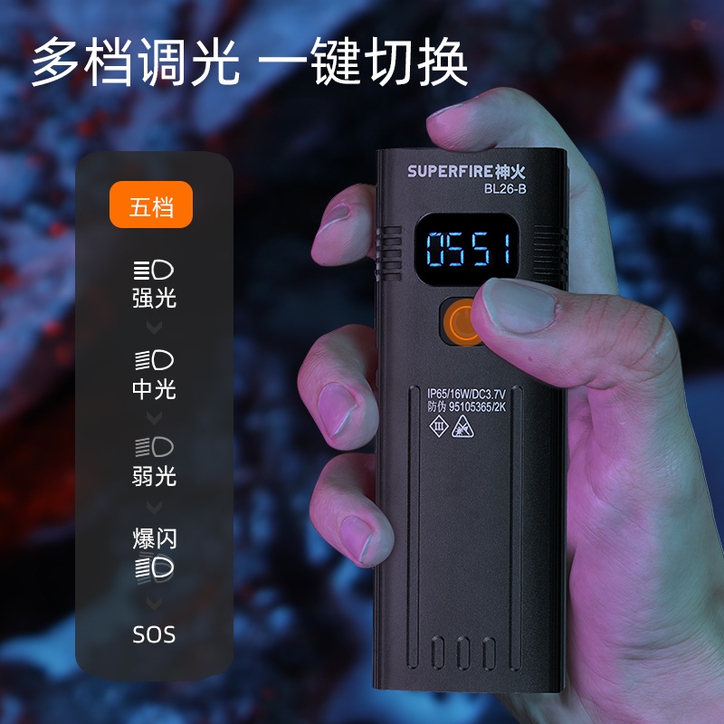 大容量電池,超長續航從容面對夜間戶外作業 多檔調光 一鍵切換 單擊按鍵調光(強光-中光-弱光-爆閃-SOS-關閉),依次循環 Type-C便捷充電 照明時綠燈,低電量綠閃爍 電量即時顯 一目了然 清晰顯示屏數字化呈現電量,隨時知曉剩余電量 續航長達46h