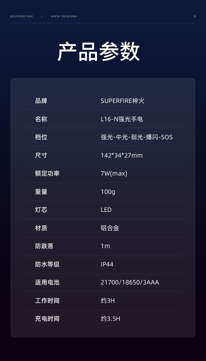 1、多檔調(diào)光,滿足不同環(huán)境下使用需求。 2、鋁合金筒身,防水耐摔。 3、推拉燈頭可實(shí)現(xiàn)伸縮調(diào)焦。 4、多重安全程序,保護(hù)手電,延長使用壽命。