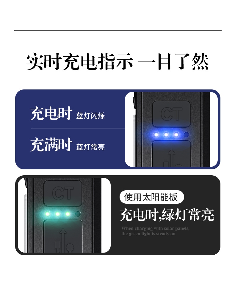 2.使用配套充電線給產品充電時,1顆藍色指示燈閃爍,依次常亮,充滿時4顆藍色指示燈常亮。使用太陽能電池板給產品充電時,一顆綠色指示