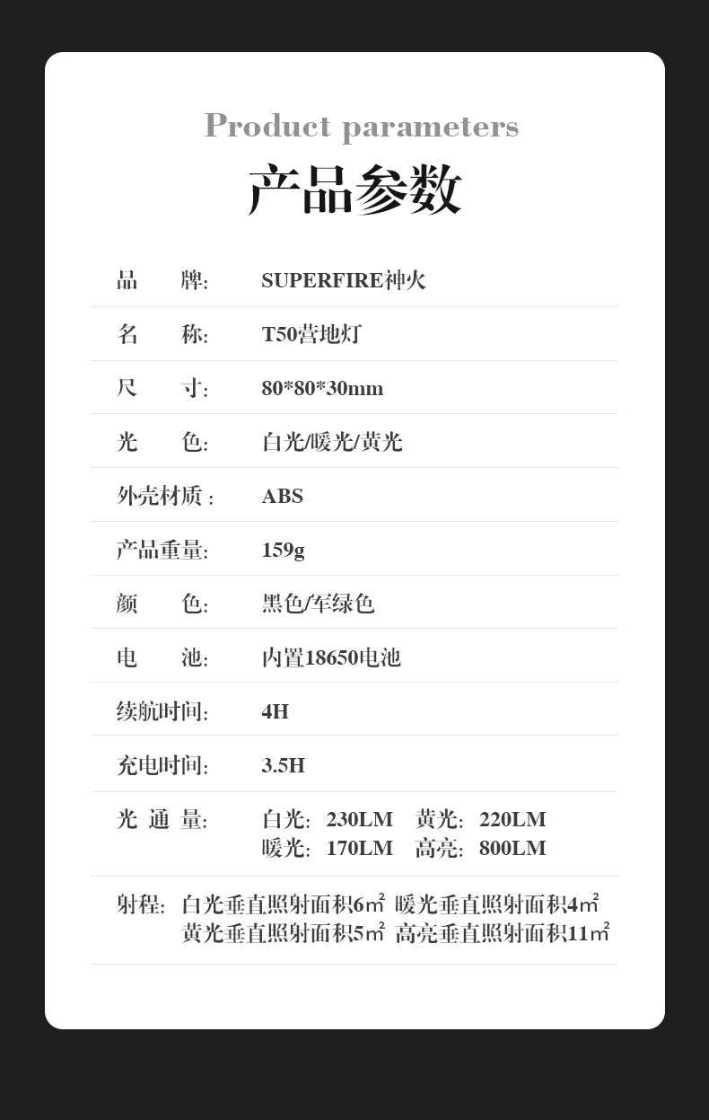 白光:230LM 黃光:220LM 暖光:170LM 高亮:800LM