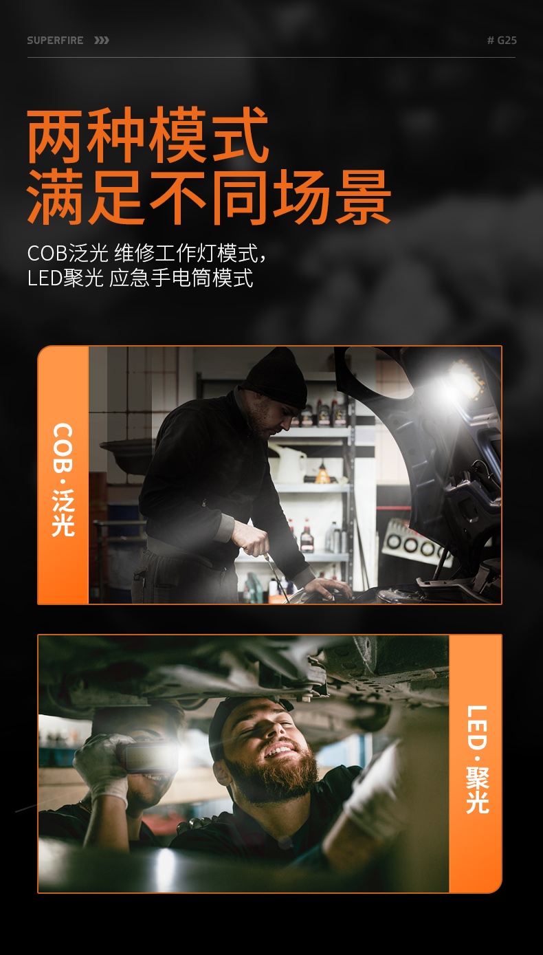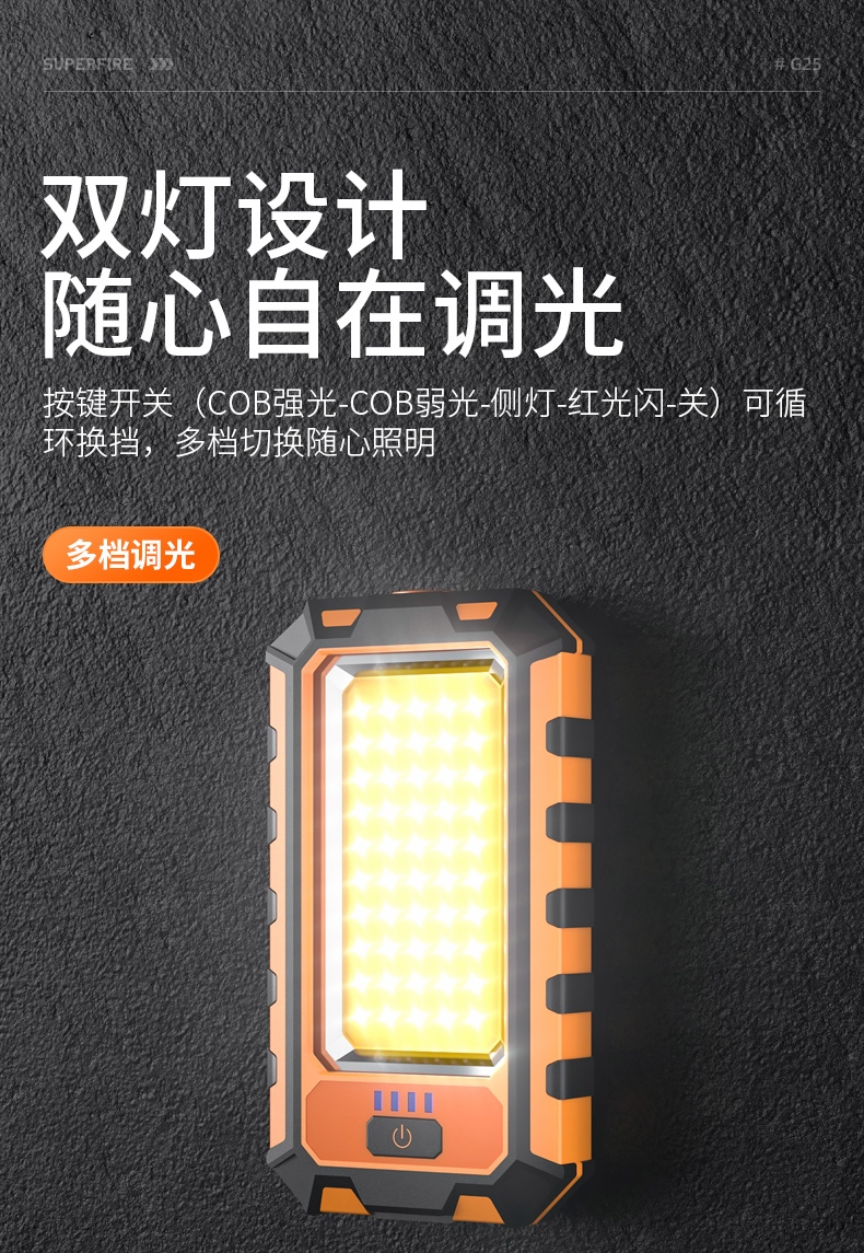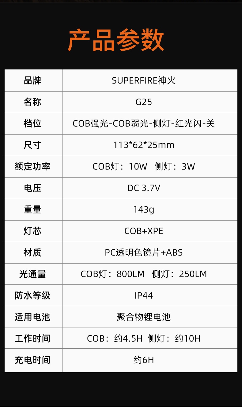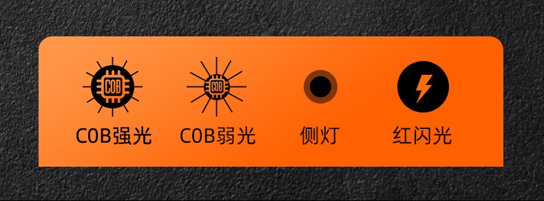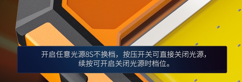 1.按壓開關開啟即COB強光擋,續按調檔(COB強光-COB弱光-側燈-紅光閃-關)可循環換擋。開啟任意光源8S不換檔,按壓開關可直接關閉光