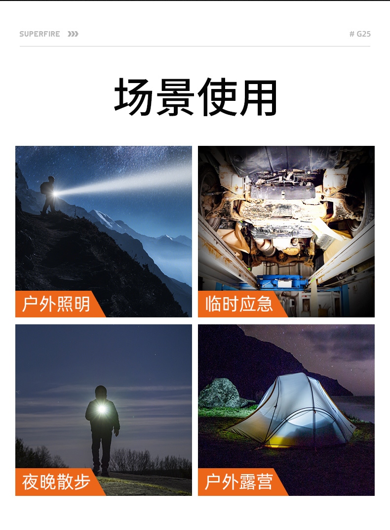 聚光主燈 亮度隨心 輕按后端開關按鈕,主燈強光點亮,續按依次切換主燈工作光-爆閃光。主燈開啟狀態下長按5秒,可實現光源色溫轉換。主燈關閉狀態下長按5秒,可開啟燈具最亮照明模式。 爆亮強光 亮如白晝 1500LM大功率高亮光源,點亮頃刻如白晝