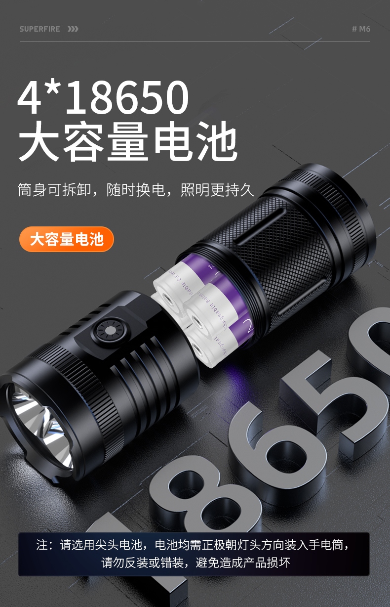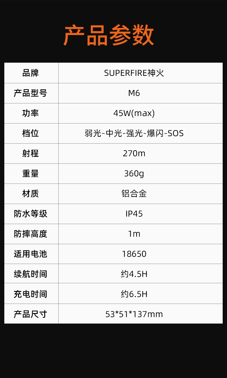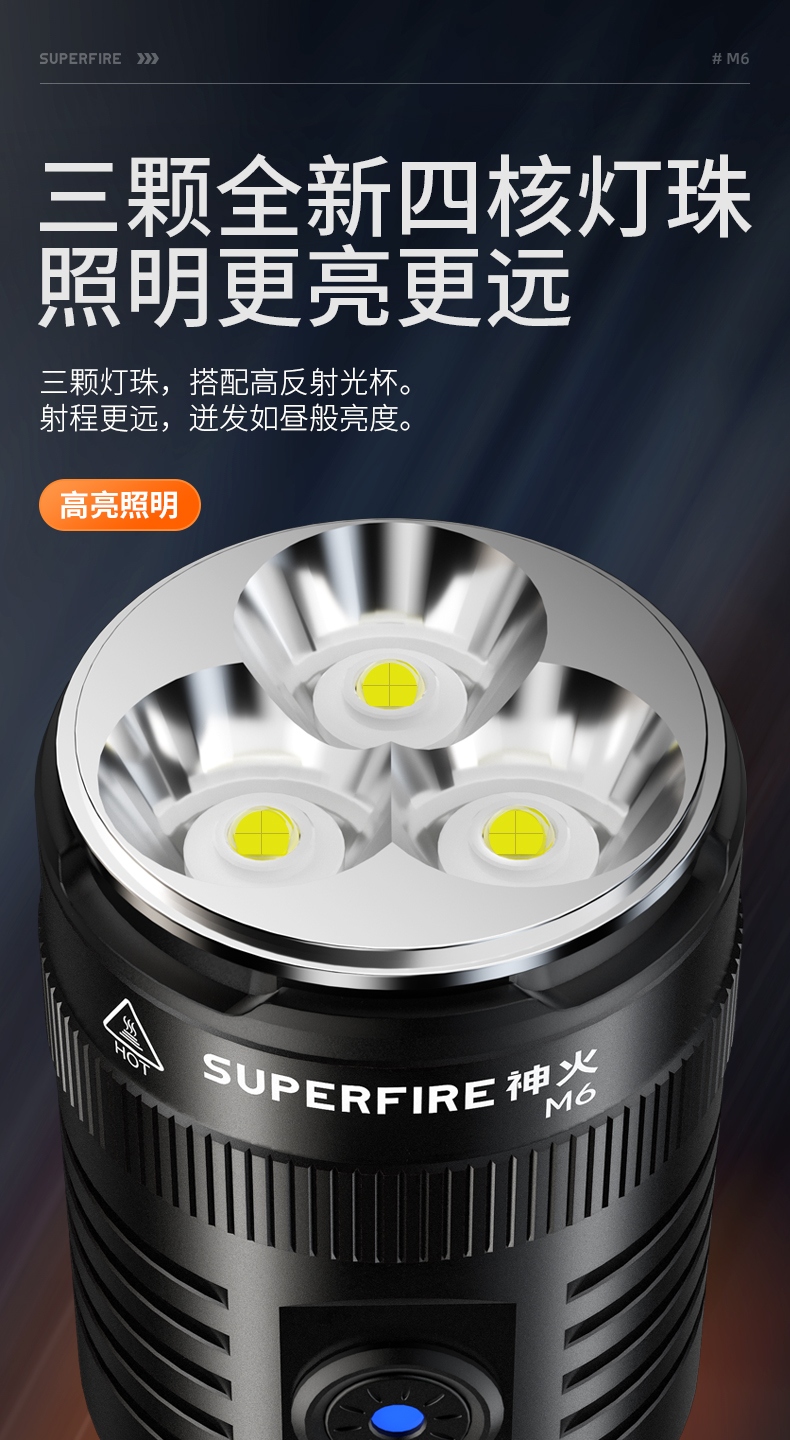 1、五檔照明模式,滿足不同的應用場景需求。 2、3顆SH-S08燈芯,3000LM高亮度 3、約4.5H長時間強光續航,照明更持久